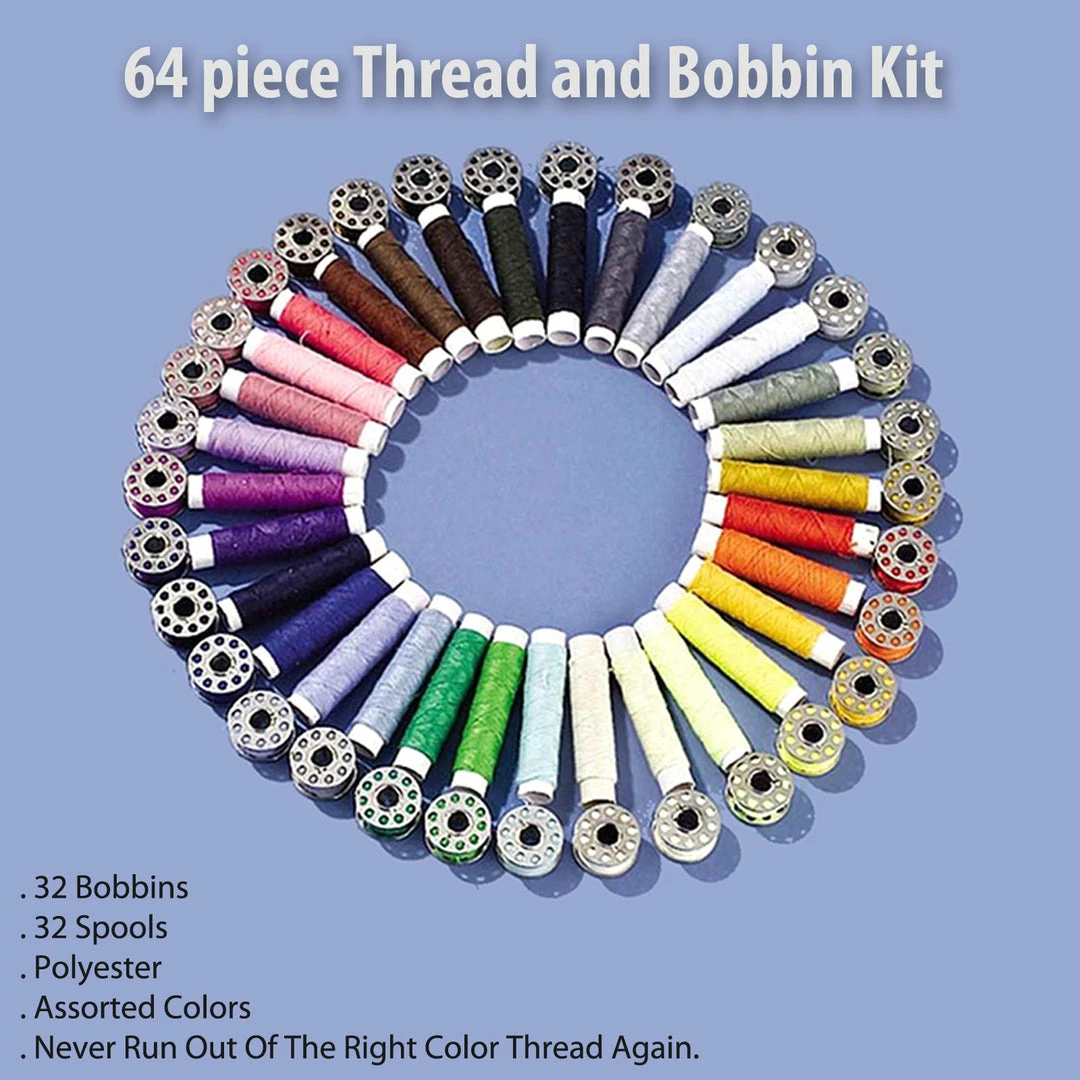 A 64-pc. Thread and Bobbin Pack that includes 32 colors of bobbins and matching spools of thread. Assorted colors of thread. Works with Handy Stitch Sewing Genie and other sewing machines.Packaging may vary.