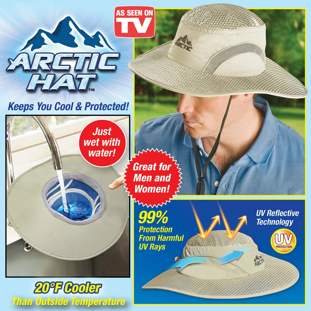 Beat by the heat? Tired of the harsh rays from the sun beating down on you? Ordinary hats don’t keep you cool or protect you from the sun’s harmful UV rays. Introducing Arctic Hat, the evaporative cooling hat with UV protection! Arctic Hat’s evaporative cooling liner retains cool water and slowly evaporates to keep you 20 F cooler than the outside temperature! Simply wet the inner liner and put on Arctic Hat™ for instant cooling relief. Arctic Hat also has a built-in UV barrier to deflect and block over 99% of the sun’s harmful UV rays. Keeping you cool and comfortable for hours on even the hottest days!