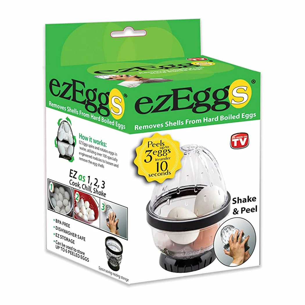 Peel up to 3 hardboiled eggs in less than 10 seconds with ezEggs! It’s so easy to use – just fill with water, add eggs and shake. The patented elliptical design and interior nodules instantly loosen and remove the shells in seconds. When you.re done, simply toss the shells in the trash. Nests for easy storage or store 6 peeled eggs in the fridge.