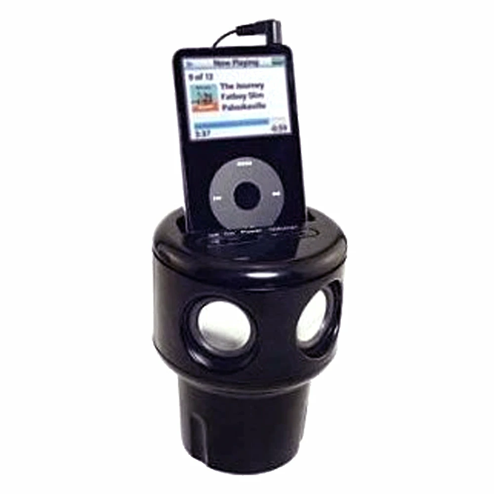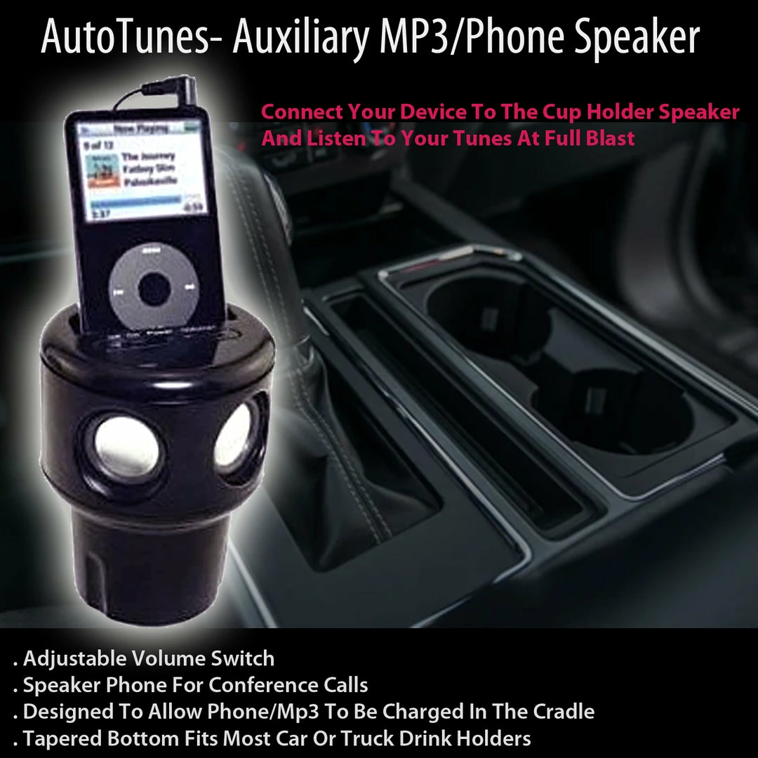Kagan AutoTunes Auxiliary MP3/Phone Speaker for Car or Office Have an older car but want to stay connected to your favorite playlist ? No problem! The AutoTunes speaker fits into your vehicle’s cup holder and holds your cell phone, smart phone, iTouch, iPod or MP3 player. Connect your device to the cup holder speaker and listen to your tunes at full blast! You can use it anywhere, really–it has a flat bottom with non-slip grips. Uses 4 AA batteries, not included. Works with: iPhone iPad iPod Blackberry Most cell phones MP3 players Laptop computers Features: Loud stereo sound Adjustable volume switch Speaker phone for conference calls Designed to allow phone/Mp3 to be charged in the cradle (it does not do the charging) Tapered bottom fits most car or truck drink holders Can be used with a 6 volt wall or 12 volt car adapter- NOT included Includes: 1 x Kagan AutoTunes Auxiliary Speaker for Car or Office ****Phones or MP3 players NOT INCLUDED******