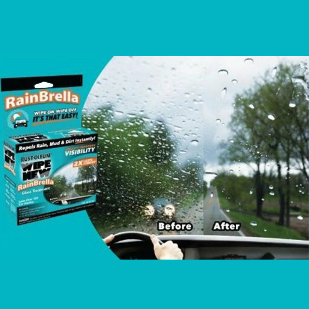 Rust-Oleum wipe new rainbrella creates an umbrella for your windshield and other auto glass. Rainbrella is great at repelling rain, mud, dirt and other such substances on automotive and exterior residential glass. Product comes in an easy to use wipe-on treatment that creates a haze-free, crystal clear barrier over numerous glass surfaces. Durable, long lasting formula resists water and other substances allowing them to roll right off surface. Helps keeps surfaces clean and significantly improves visibility and safety in poor conditions.
