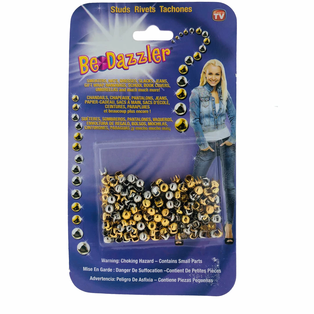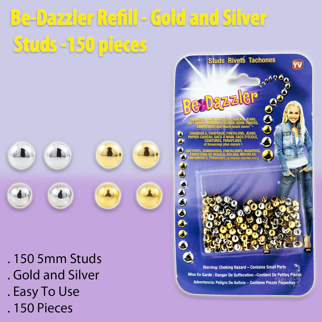 Be-Dazzler Studs Refill – Gold and Silver – 150 pieces. Stud refill for BeDazzler and BeDazzler Mini. Use to decorate sweaters, hats, dresses, slacks, jeans, gift wrap, handbags, school book covers, umbrellas and much more. Let your imagination run wild! For use with the original Bedazzler. Includes: 75 gold and 75 silver studs. Recommended for children ages 9 and up.
