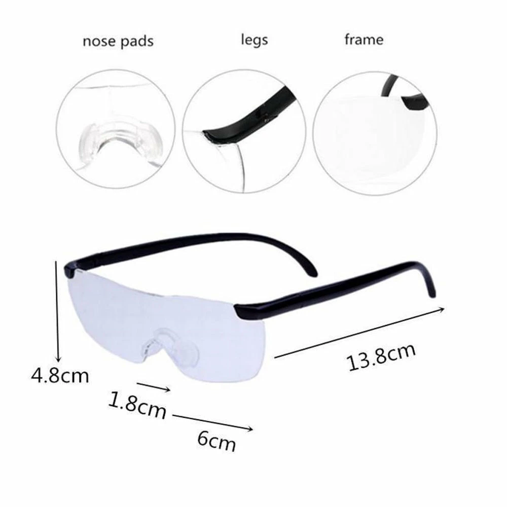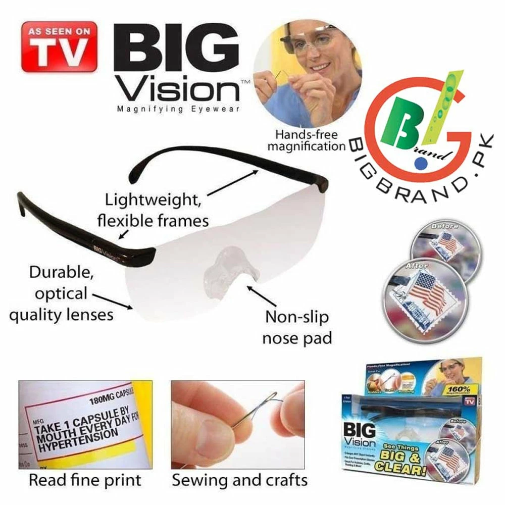 Increase your clarity for looking at things up close with the As Seen on TV Big Vision. They are flexible, lightweight unisex frames that are easy to wear. These Big Vision magnifying glasses increase your ability to see small things by 160 percent with no distortion. Put them on over prescription eye wear, contacts or your shades. These hands-free magnifying glasses come in handy for reading a book, doing various crafts, hobby work and much more.