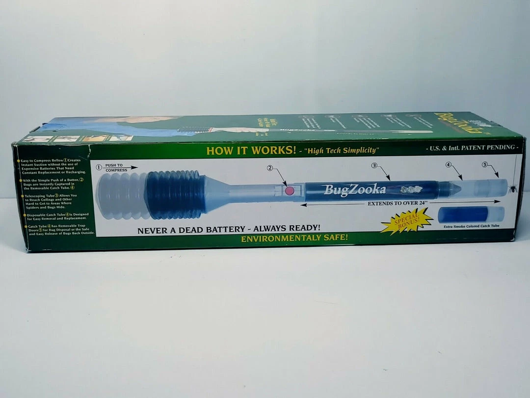 BugZooka is a fast, simple, and clean way to rid bugs from your home. The innovative and light weight new BugZooka lets you keep your distance and avoid bug squish and splatter without expensive batteries or toxic chemicals. It’s unique patent pending design creates 10X the instant suction of heavy battery powered devices. BugZooka catches bugs instantly.