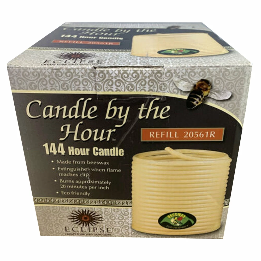 Candle by the Hour – 144 Hour Refill (20561R)With hours of dreamy candlelight in your Candle by the Hour, you can set the amount of time it burns, hour by glowing hour. Simply feed the pliable beeswax coil through the candle clip in increments of 3 inches or less.Three inches of Candle will burn for approximately 1 hour. Set your nights alight with the Candle by the Hour.Candle by the hour is based on candle design of the 1600s but now has a patented clip which extinguishes the candle automatically when it burns down inside the clip. Made of 100% beeswax because you breathe what you burn. Unlike paraffin candles that are made from petroleum sludge, beeswax candles actually help clean the air. Beeswax produces negative ions when burned which helps remove the pollutions and allergens from positive ions, allowing them to drop harmlessly to the ground.Includes: Candle by the Hour – 144 Hour Refill (20561R) REFILL ONLY, NO BASE