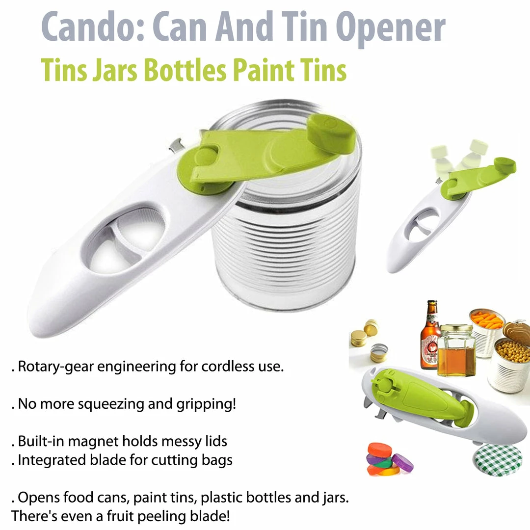 Cando Can Opener has eight different, essential ways to open anything from plastic bags to jam jars! Think of the convenience of knowing that, whatever you want to open: paint tins, jam jars, food cans, glass bottles with metal caps, plastic bottles with screw-on tops, even fiddly ring-pulls (on so many food cans as well as drinks these days), Cando Can Opener opens them all! PLUS, there’s even a fruit peeler and a blade to cut open plastic bags.