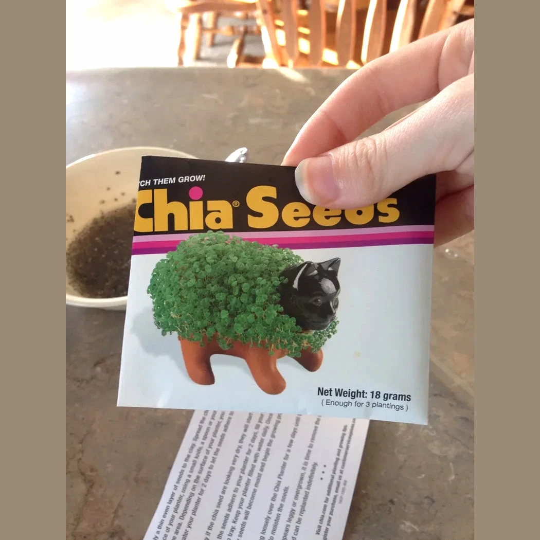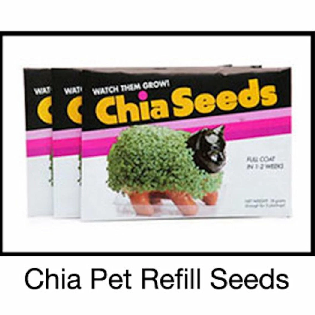 Extra seeds for the Chia Pets and Heads. Can be used with all Chia Pets and Heads decorative terra cotta planters. A fun and amusing gift for any age, any occasion. Grows daily to reach full ‘coat’ in 1-2 weeks. Includes: 3 packs of seeds- each packet is enough for 3 plantings