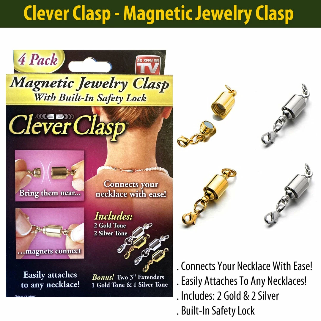 Clever Clasp makes securing your necklaces, bracelets or anklets a snap! Just bring the ends near, and they click together every time. You don’t even have to see what you’re doing. Clever Clasp attaches easily to any jewelry. Just bring the ends of the Clever Clasps near each other and they instantly click shut and safely lock, creating a super-magnetic bond, which is doubly, secured by a twist lock. The set includes 2 gold tone and 2 silver tone Clever Clasps as well as bonus 3″ silver and gold extenders.Includes: 4 clasps (2 silver tone, 2 gold tone) / 2 extenders (1 silver tone, 1 gold tone) SHIPS IN MAIL ORDER PACKAGING.