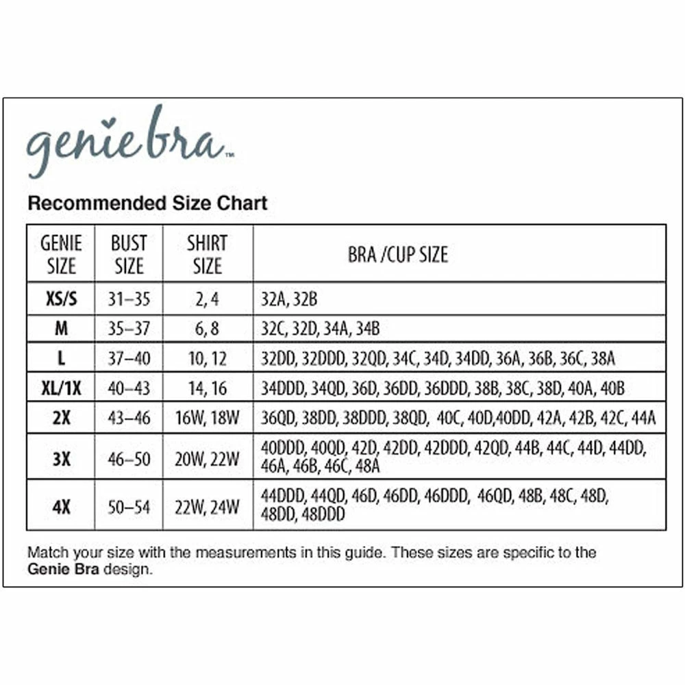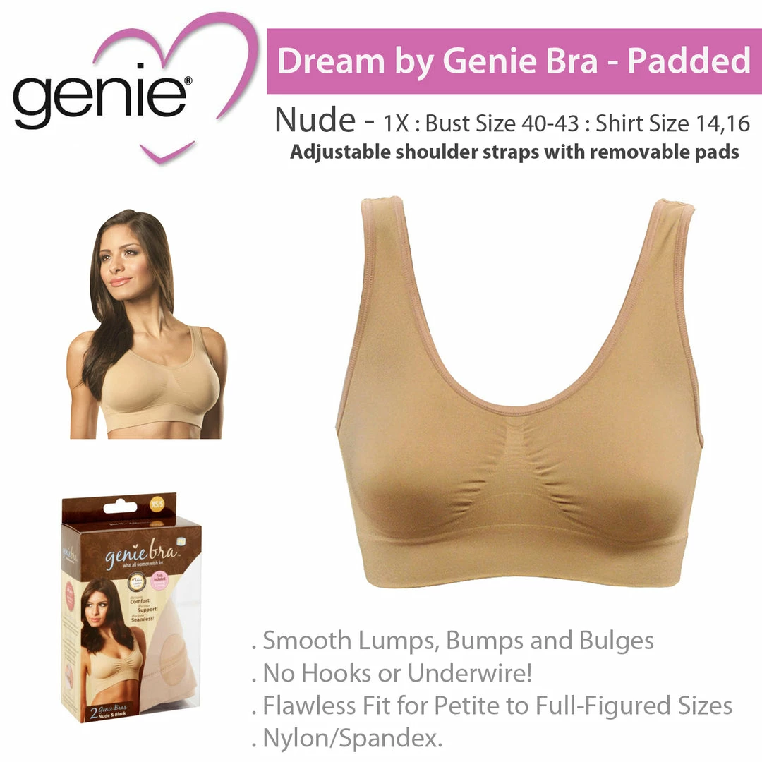 Dream by Genie is the seamless pullover bra with adjustable lift, shape and support. Enhanced with 360® SmoothSlim technology, it conforms to your shape and helps eliminate spillage and underarm bulges. The full back control panel helps smooth away back fat. … InstaCool technology keeps you cool, comfy and dry. 1X : Bust Size 40-43 : Shirt Size 14,16