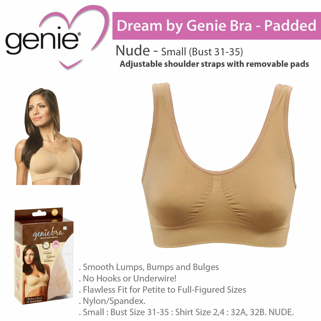 Dream by Genie is the seamless pullover bra with adjustable lift, shape and support. Enhanced with 360 SmoothSlim technology, it conforms to your shape and helps eliminate spillage and underarm bulges. The full back control panel helps smooth away back fat. … InstaCool technology keeps you cool, comfy and dry. Small : Bust Size 31-35 : Shirt Size 2,4 : 32A, 32B. NUDE.