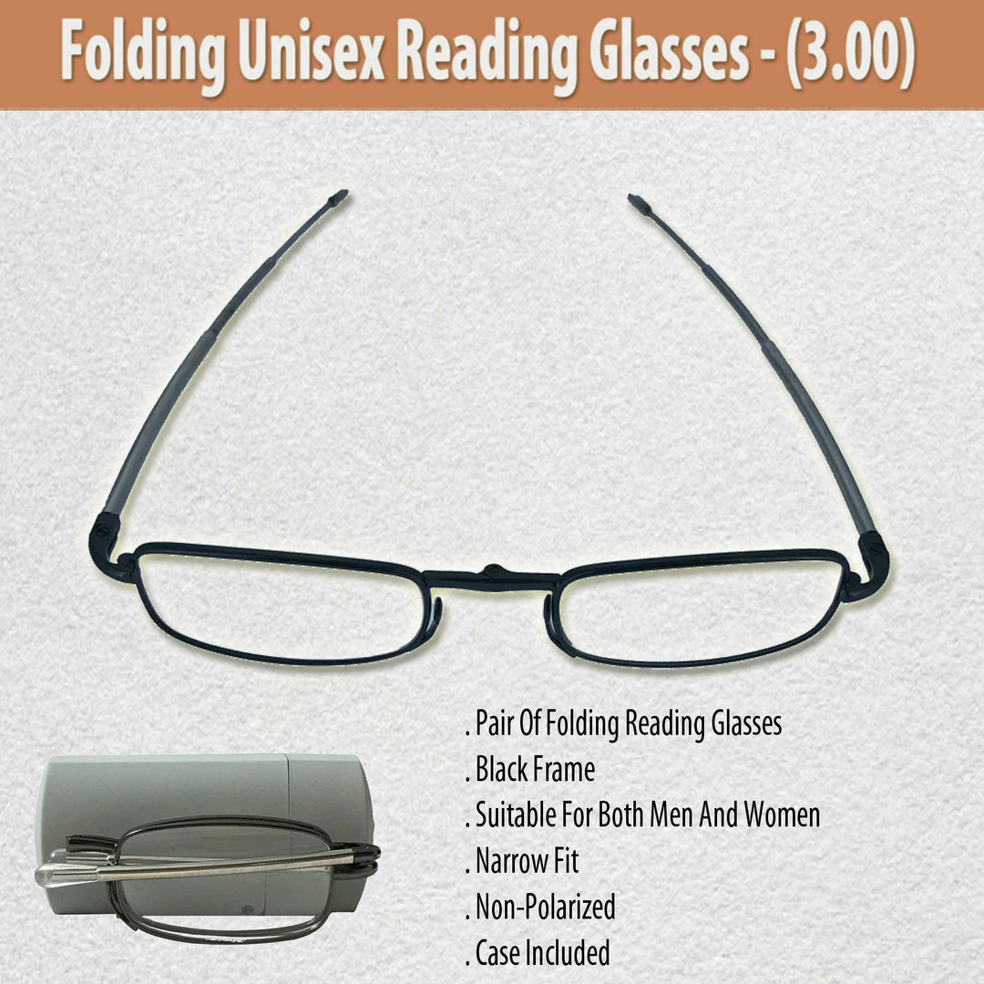 A great pair of folding reading glasses. Black frames. These glasses are suitable for both men and women.