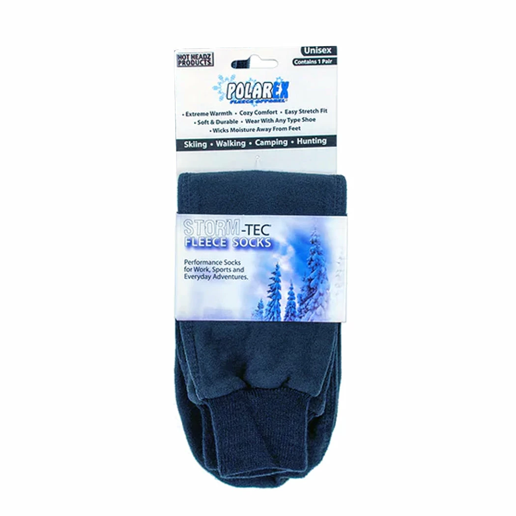 Polar-Ex Fleece Storm-Tec Fleece Socks (Black) Performance socks for work, sports and everyday adventures. Great for skiing, walking, camping and hunting. Wicks moisture away from feet. Can be worn with any type of shoe. Soft and durable, easy stretch fit that offers extreme warmth and cozy comfort. Stretch-Warmth Technology- In creating the ideal all season sock, Hot Headz applied breakthrough fabric technology to bring you socks that we know you will love. Fabric content- 96% Polyester, 4% Spandex Medium- Men’s 9-10.5/Women’s 9.5-11.5