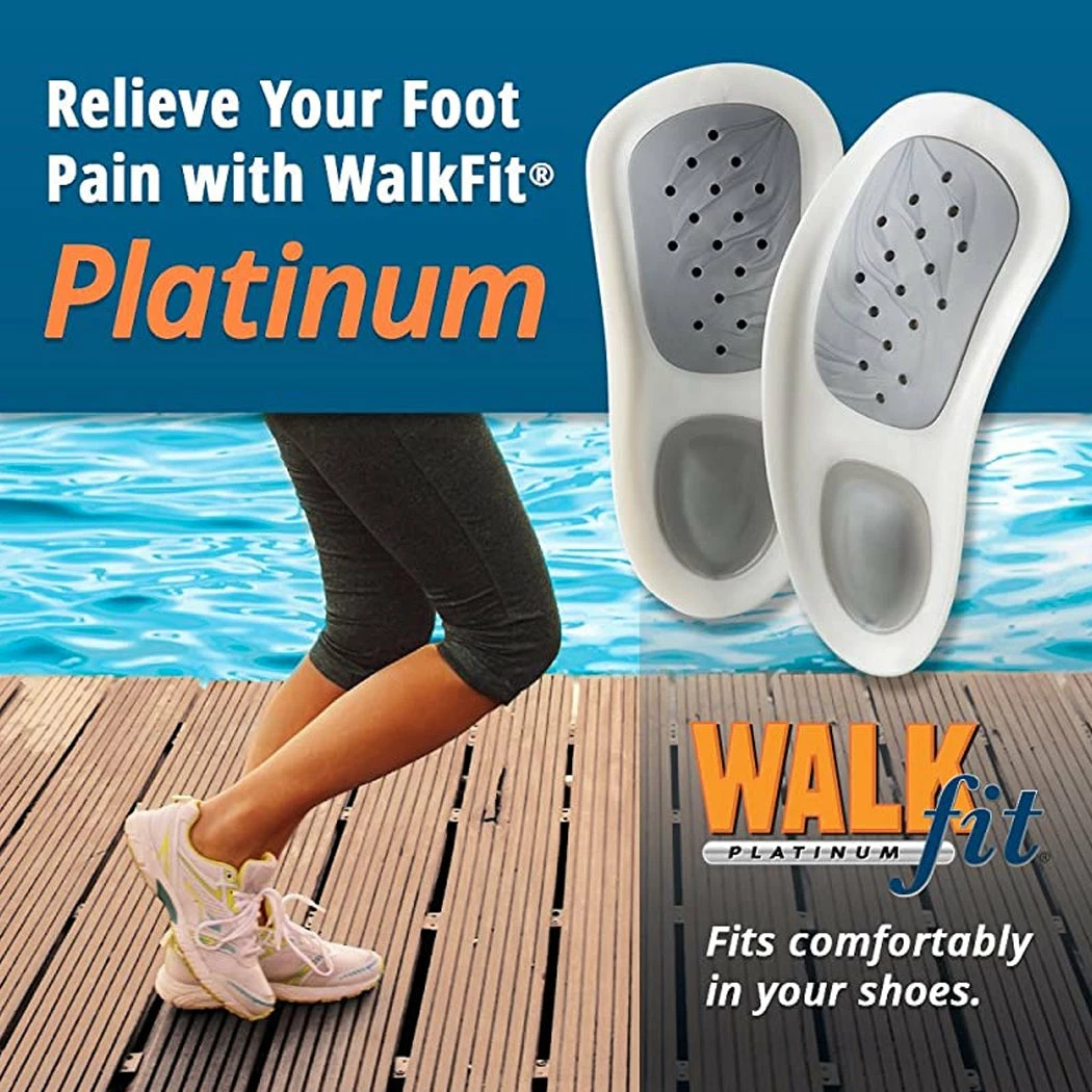 New and improved design! NEW! We’ve added a unique gel pad to our Bio-Lock heel cup for advanced cushioning and shock absorption. So you get cushioning where you need it and firmness where you need it! NEW! Patented Nano-Silver technology. Realigns your spine and pelvic area to reduce knee, hip and lower back pain. Independent clinical study showed Walkfit technology relieved foot pain in 90% of users. NEW WalkFit Platinum orthotics takes comfort and stability to the next level with extra cushioning and odor protection. See how the world’s #1 custom-fitted orthotic can improve your life Walkfits help reduce pain in feet, knees, hips, and back. Each pair of WalkFit insoles comes with 3 customizable arch inserts, low, medium, and high. Once your feet have adjusted to the WalkFit Orthotics, you will experience a noticeable increase in foot support and comfort. Available in mens sizes 6 through 14 1/2 and womens sizes 5 through 12 1/2