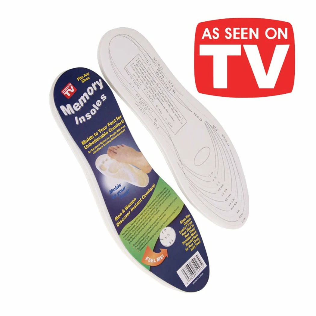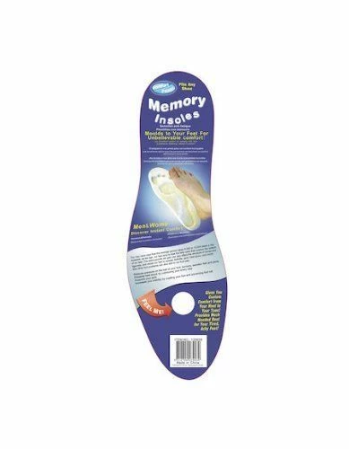 Comfort Foot Memory Insoles Memory insoles are a lot like memory foam. They form perfectly to your feet to provide a secure fit, comfortable feel and relief for tired, achy feet. These can be cut to size to fit any size shoe. Each measures 14 1/2″ long. The insoles that give instant comfort. Molds to your feet for unbelievable comfort. The perfect solution for people with foot conditions that require ultimate comfort. Relieves pressure on the ball of the foot Prevents heel shock by cushioning every step Supports the arch of the foot Increases stability by cradling the foot and preventing foot roll