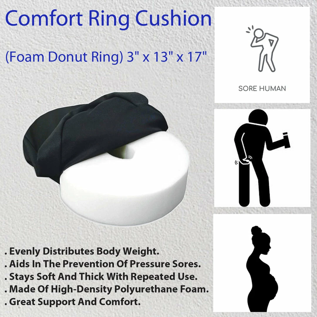 Comfort Ring (Foam Donut Ring) Cushion (3″ x 13″ x 17″) Evenly distributes body weight. Great support and comfort. Aids in the prevention of pressure sores. Made of high-density Polyurethane foam. Stays soft and thick with repeated use. Cover is removable and washable.Includes: 1 x Comfort Ring (Foam Donut Ring) Cushion (3″ x 13″ x 17″)