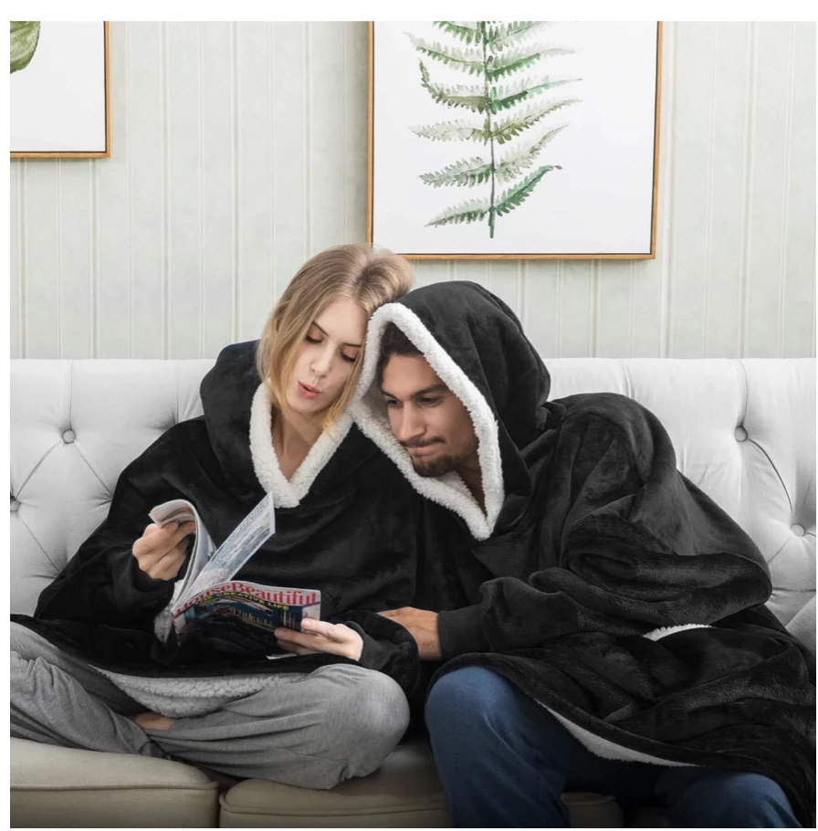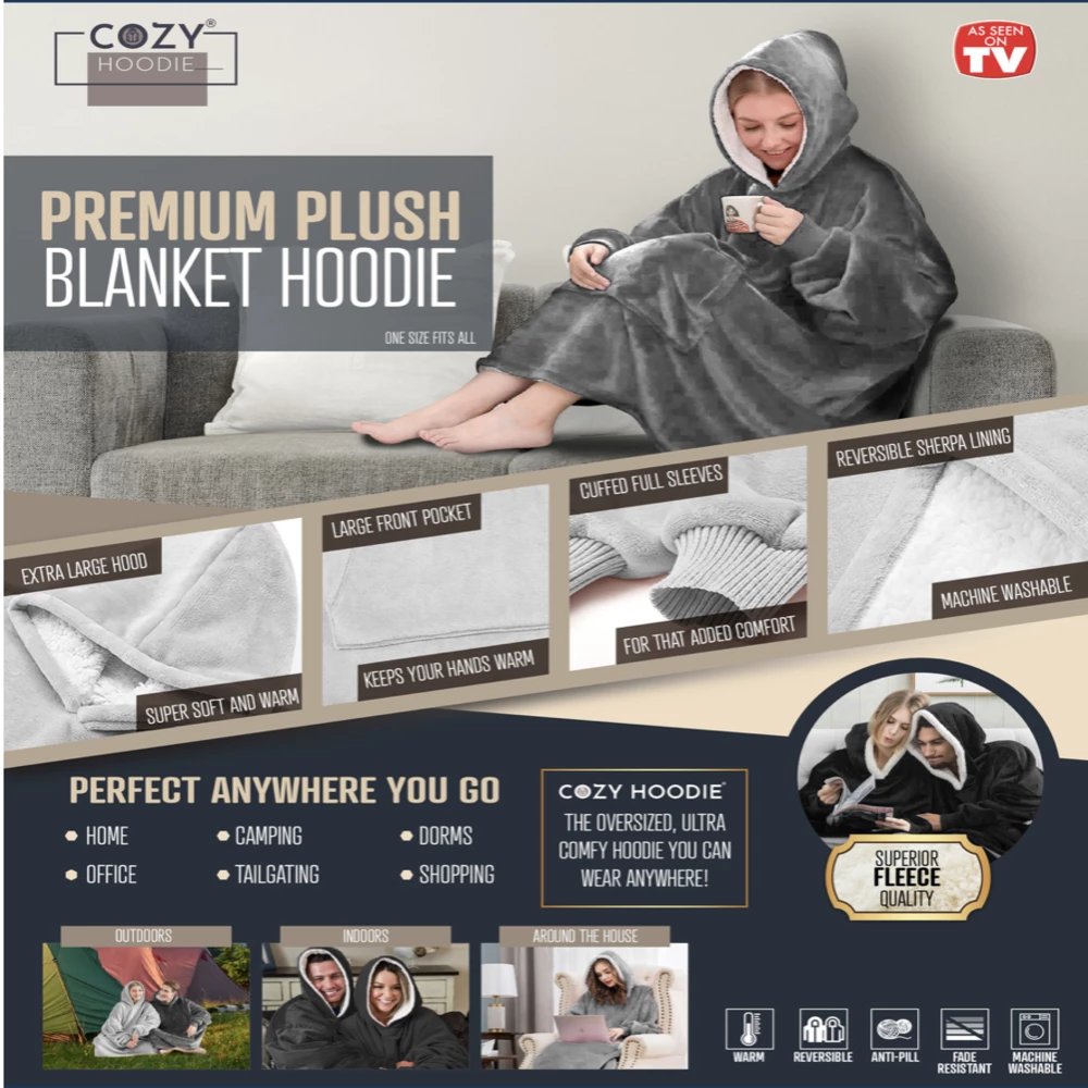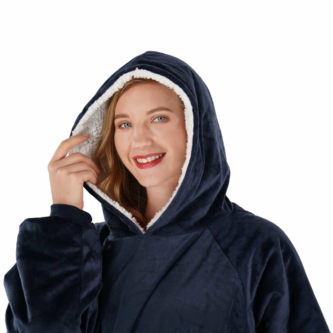 Comfortable oversized hoodie that combines the warmth of a cozy blanket with the comfort of your favorite hoodie. Made from ultra-soft Fleece and lined with ultimate in warming Sherpa comfort! Ultra Plush Wearable Blanket Hoodie is a one size fits all to keep you cozy & Warm from head to toe! It’s reversible so you can choose your favorite look. There’s even a big, Roomy pocket to keep what you need right at hand! Whether you are relaxing on the couch, running errands, or outside cheering on your favorite team, huggle hoodie will keep you warm and toasty! Just slip it on and the chill is gone! Size: 80 x 90cm
