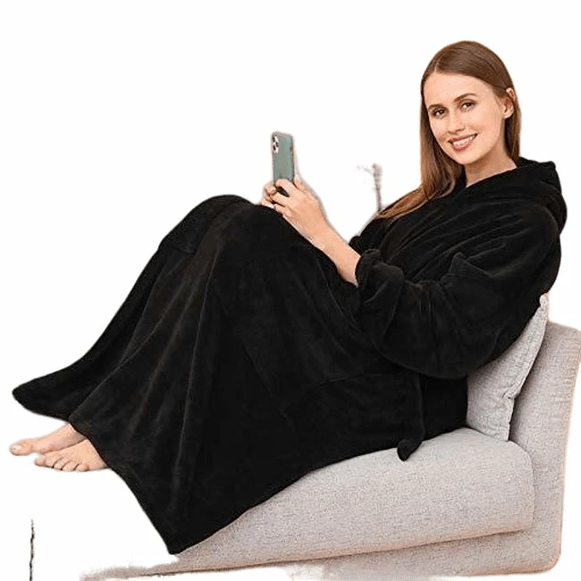 Fleece blanket (BLACK) with sleeves. This blanket is perfect for relaxing whether on the porch during a cool day or on your couch watching a movie. Never worry about being cold again with the added arm sleeves the blanket never has to come off.