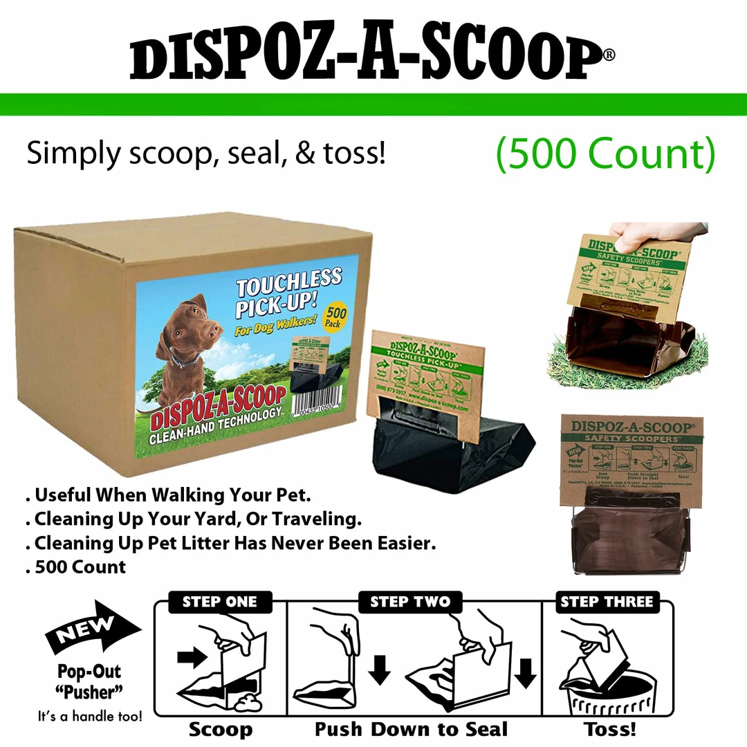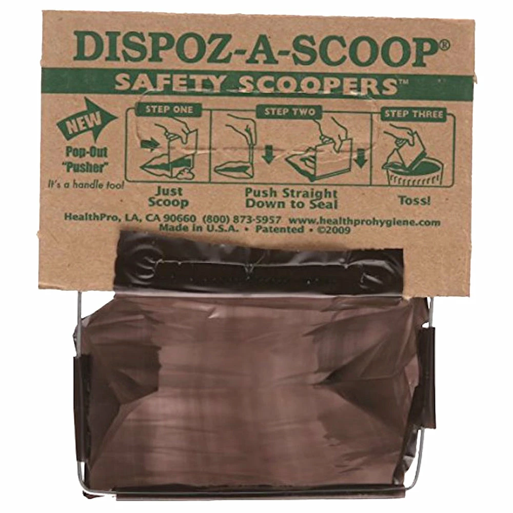 Cleaning up pet litter has never been easier. Scoop waste into this convenient bag (using the metal edge), press unit against the ground to seal, and the waste is ready for proper disposal. Useful when walking your pet, cleaning up your yard, or traveling. Dispoz-A-Scoop is completely sanitary and features a patented, self-sealing closure to ensure clean, odor-free disposal. Compact enough to fit in a pocket or purse. No touch, no odors, no problem! Scooper (6″ L x 4-3/4″ W) is large enough to use for larger dogs. In cases where waste might be more than average, two bags can be used. The Dispoz-A-Scoop bags have an airtight, waterproof seal, so if the bag gets wet, durability is not affected. Finally a hassle free, environmentally friendly solution to pet pollution! Made in the U.S.A. Please note that these come mail order packaging (bulk packed) and not in a retail box.