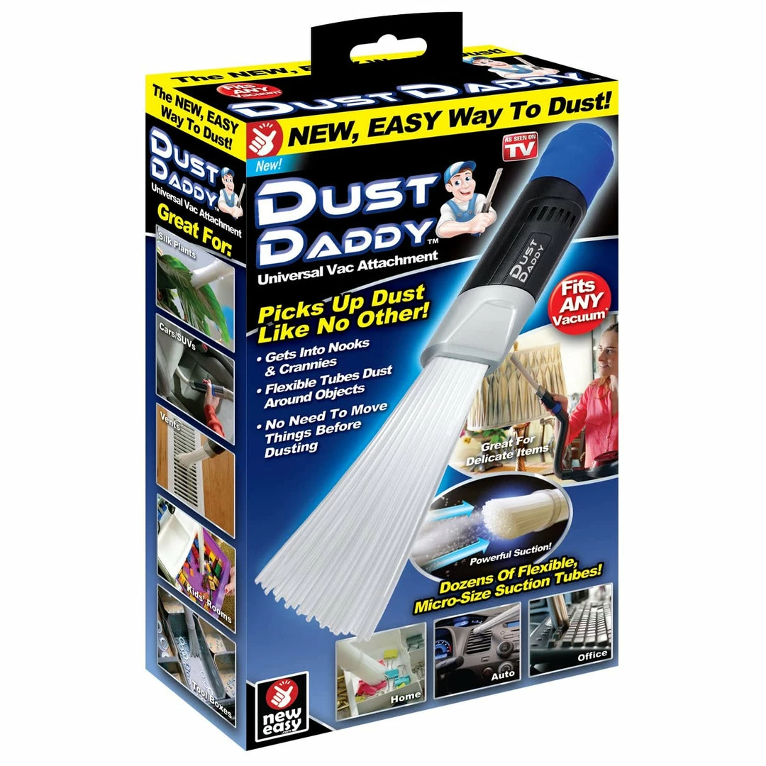 It’s those nooks and crannies, the hard-to-reach corners and odd angles in your home that make vacuuming a chore. Say hello to Dust Daddy, the universal vacuum attachment that fits almost any vacuum to get into those crevices. Dozens of individual and flexible suction tubes go anywhere dust hides, like book shelves, light fixtures, window blinds, couch jewelry boxes and much more. Who’s your daddy? Dust Daddy! Comes in mail order packaging.