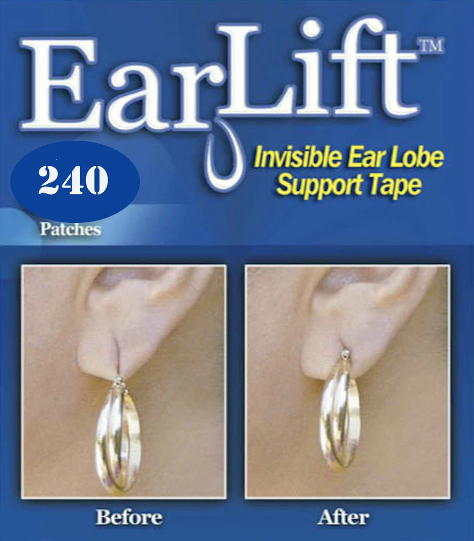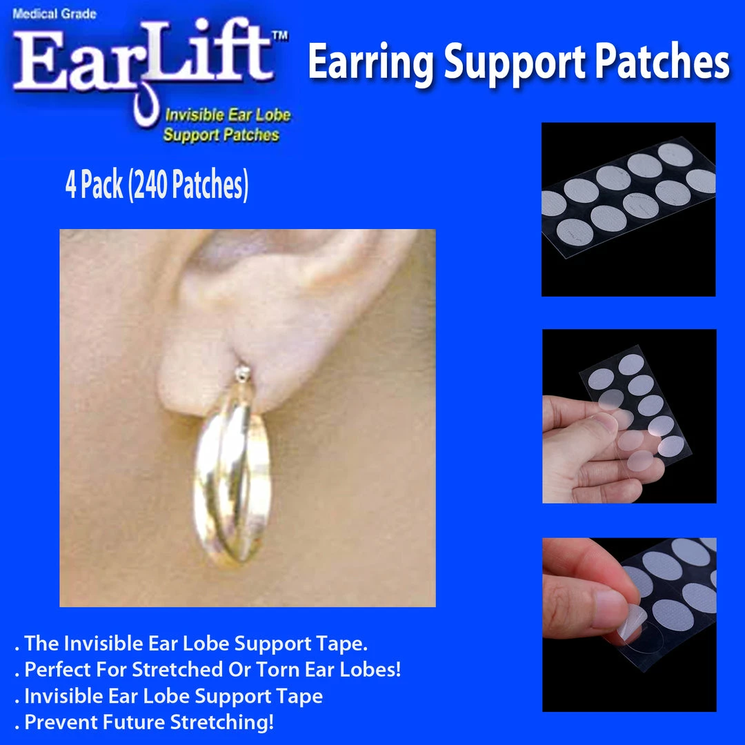 EarLifts for your earlobes Are your earlobes sagging, torn or damaged? Do your earrings wobble, tilt or not sit properly? Then you need Ear Lifts, the remarkable earring support solution for pierced ears. EarLifts are invisible and works virtually all types of pierced earrings… studs, hoops, dangles and hooks. Fix your stretched and droopy ear lobe problem instantly. Just peel and press and wear all of your favorite earrings in comfort and confidence. So now you can wear all of your favorite fashion earrings. EarLift is an invisible disc (patch) made of a medical grade, hypoallergenic (skin friendly) adhesive that instantly secures earrings by taking weight off the earring hole, relieving the ear lobe of pressure. Stretched, sagging earlobes, look tight and taught. Enlarged or torn ear holes vanish. Drooping earrings now sit up perfectly.