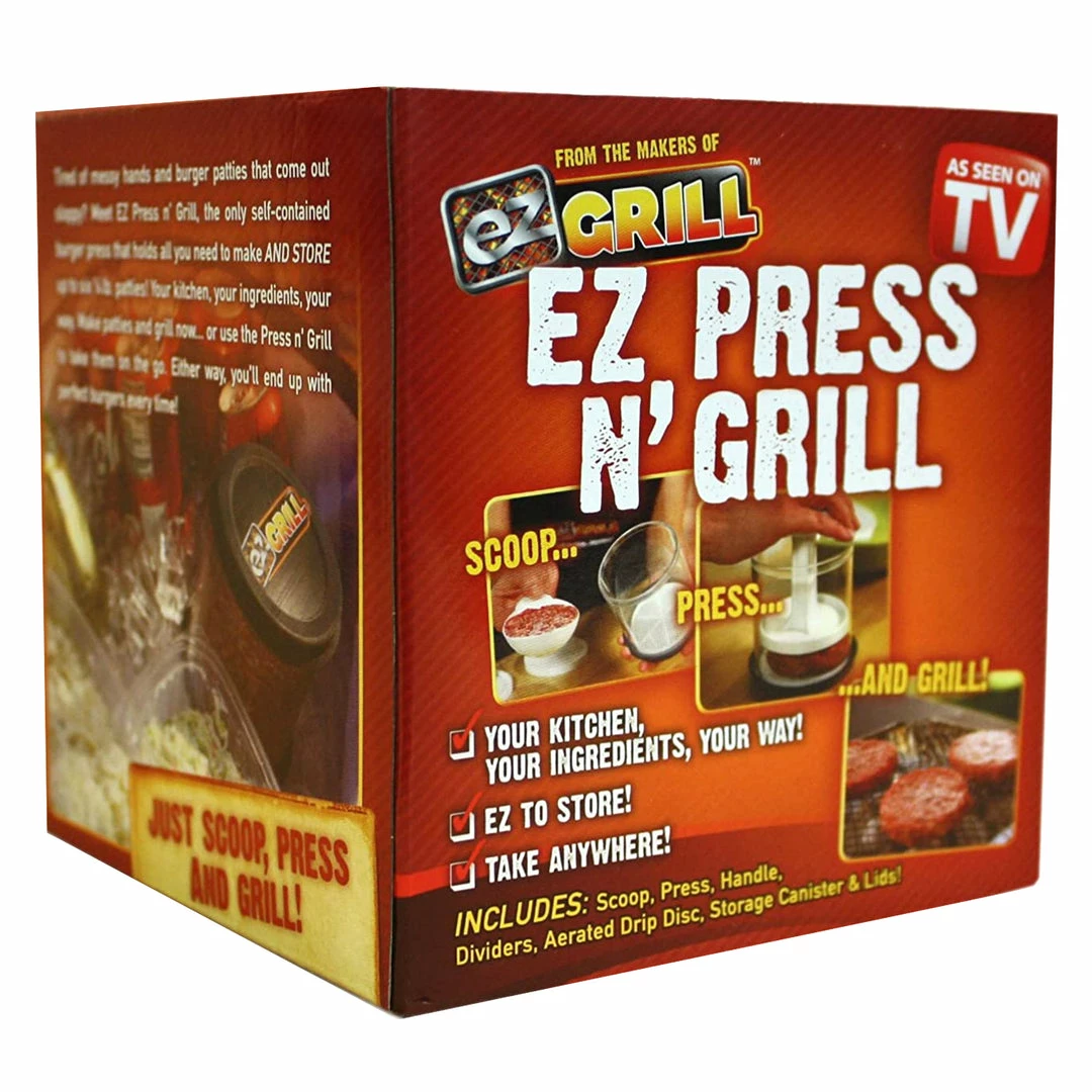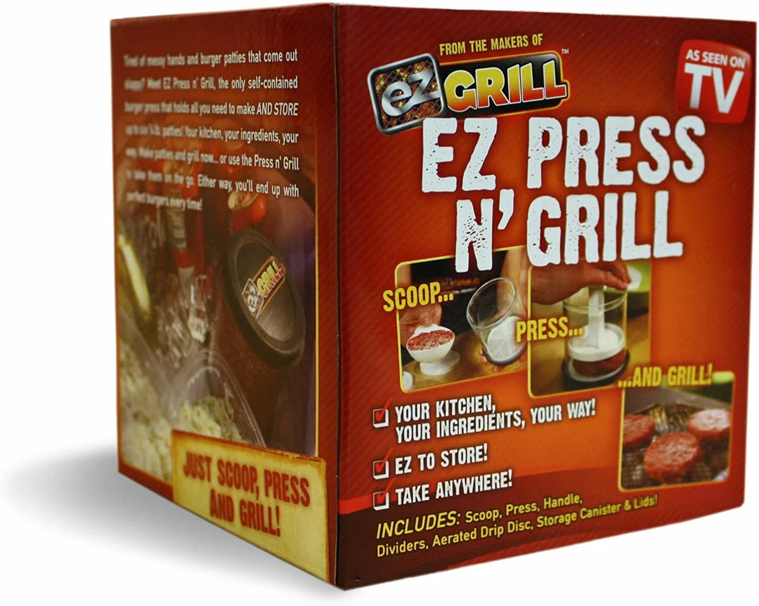 Tired of messy hands and burger patties that come out sloppy? Meet EZ Press n’ Grill, the only self-contained burger press that holds all you need to make. Your kitchen, your ingredients, your way. Make patties and grill now… or use the Press n’ Grill to take them on the go. Either way, you’ll end up with perfect burgers every time!