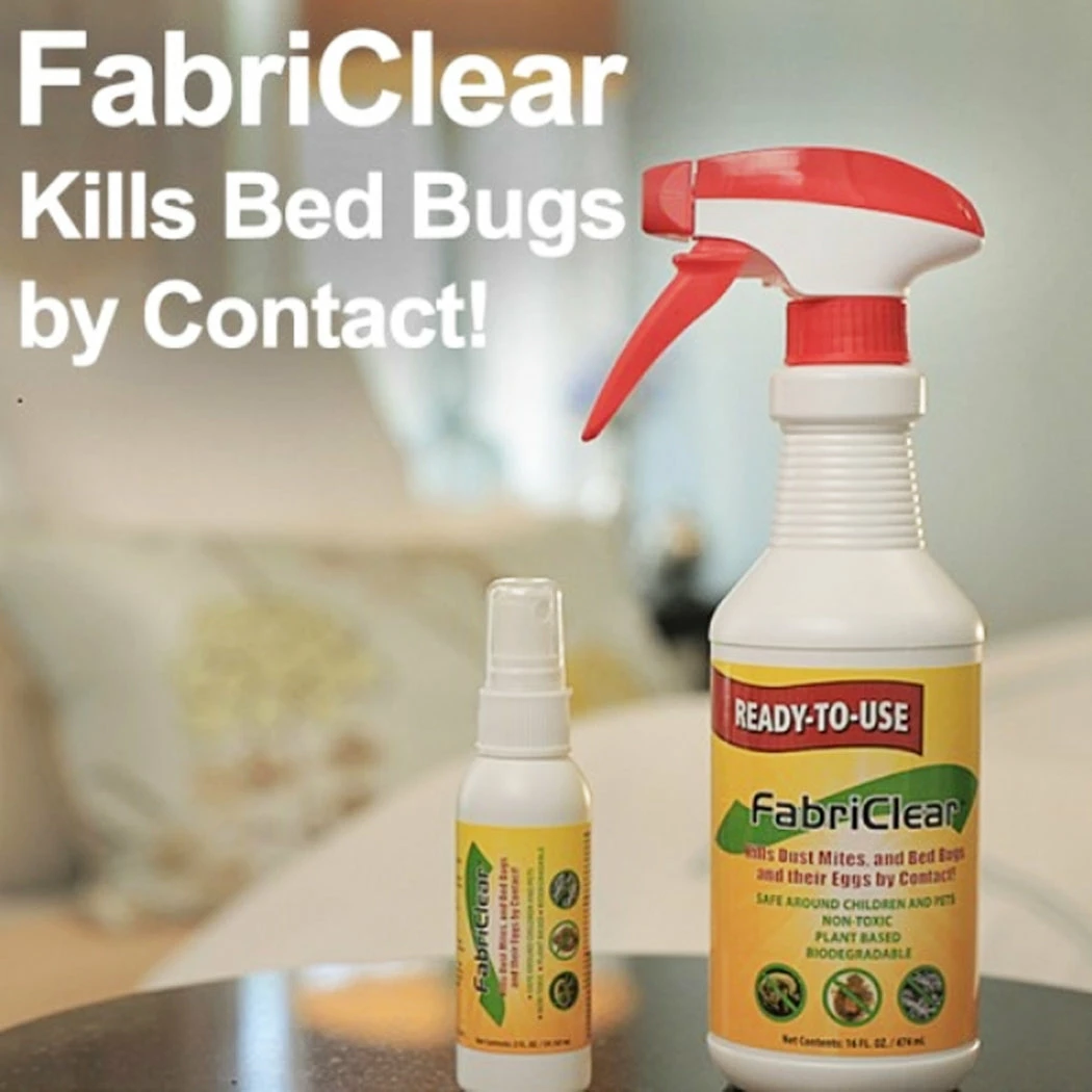 Fabri-Clear/XOUT Bed Bug Spray eliminates bed bugs, dust mites, eggs and larvae by contact.Fabri-Clear /XOUTis ready to use and eliminates bed bugs, dust mites and their eggs by contact. It is naturally derived multi-purpose insecticide that helps to eliminate dust mites, bed bugs and their eggs and allergens. It is safe to use around children and pets. Fabri-Clear/XOUT has a pleasant, refreshing botanical scent. Works great on: mattresses, pillows, cushions, beds, duvet covers, carpets & rugs, curtains & drapes, furniture and more. Includes: 1 x 16 oz spray 1 x 2 oz travel spray