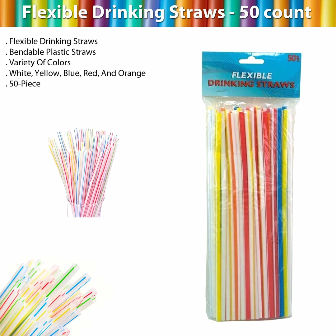 Great for parties, picnics and casual dining, this 50-piece Flexible Drinking Straws Set features striped, bendable plastic straws in variety of colors. Comes packaged in a poly bag with a header card. Colors: white, yellow, blue, red, and orange. Materials: plastic