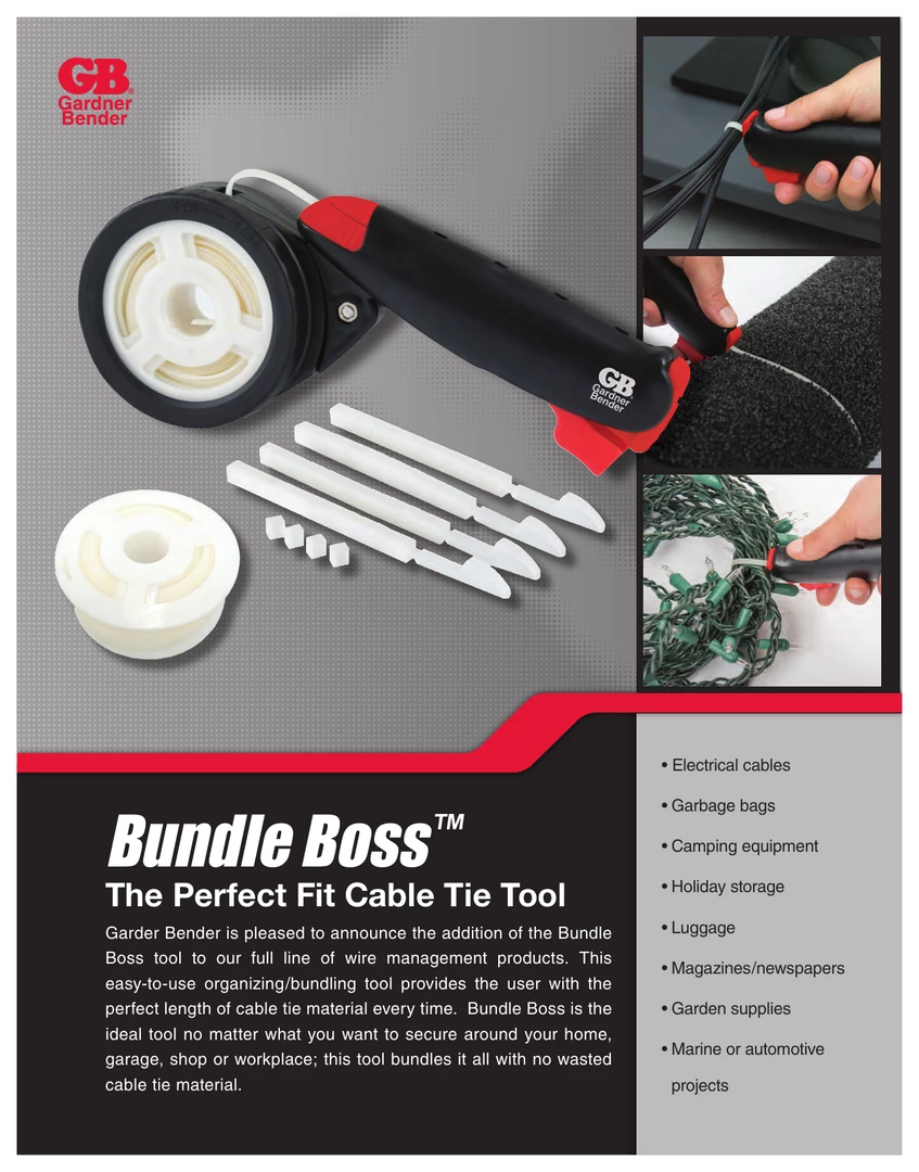 This easy to use organizing and bundling tool kit provides the perfect length of cable tie material every time! The Bundle Boss is the ideal tool no matter what you want to secure around your home, garage, shop or workplace. From electrical cables to garbage bags, from camping equipment to luggage, and from automotive to crafts; this tool bundles it all with no wasted cable tie material. Simply pull out the length of cable tie needed, wrap it around your bundle, feed it into the locking clip at the front of the tool, pull to tighten, and release the trigger to secure the locking clip – you’re done! No more cutting off cable tie tails or connecting cable ties together to get the length you need.