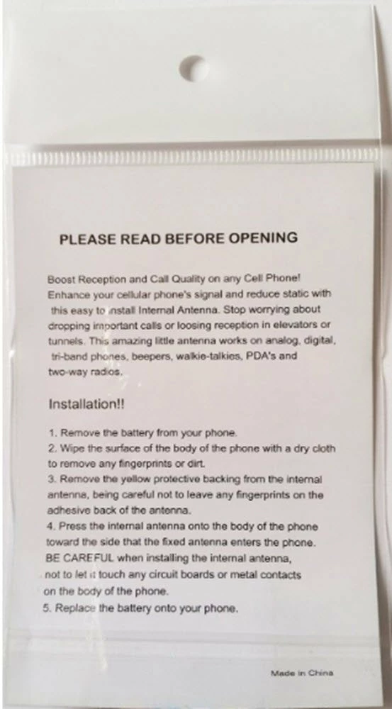 As Seen On TV, sealed, shrink wrapped, large number available, new and improved generation 2 cell antenna booster, reduces static, improves signal strength and tunnels, buildings, extends cell range while using cell in elevators and remote areas! it should increase at least one bar of signal strength in your cell, easy to install, it’s like having a 12 foot antenna on your cell! retails $19.95, get it here fast shipping and discount!