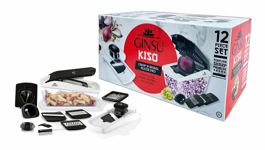 Regardless of the meal, the Ginsu Chop ‘N Spiral Slicer Pro simplifies every day food prep. Equipped with 8-attachments including graters, ribbon slicers, and julienne blades, the Chop ‘N Spiral Slicer Pro will be your best friend in the kitchen. Chop hearty vegetables or slice delicate fruits all with ease. Surprise your guests with fresh crudites platters and homemade potato chips or fries. The built-in container keeps your countertops clean. All the accessories are dishwasher safe and easily store inside the container.