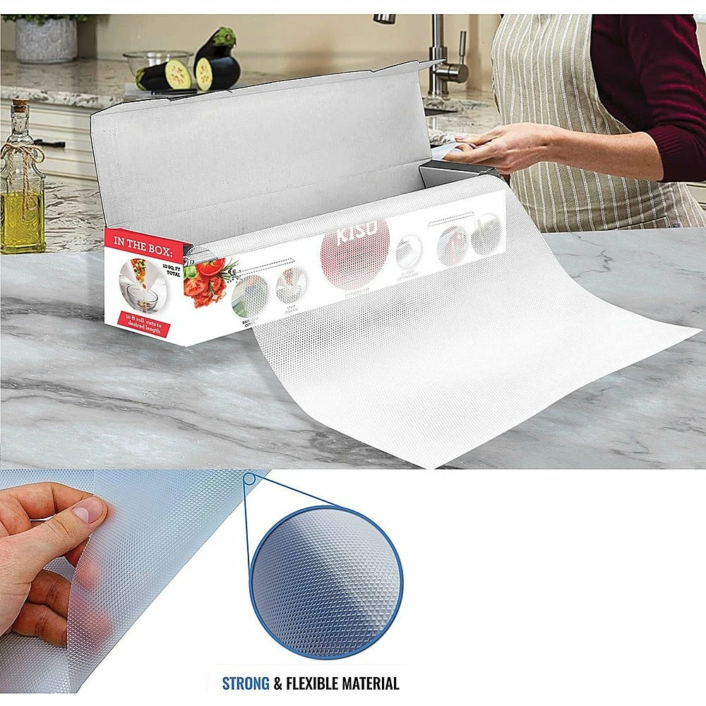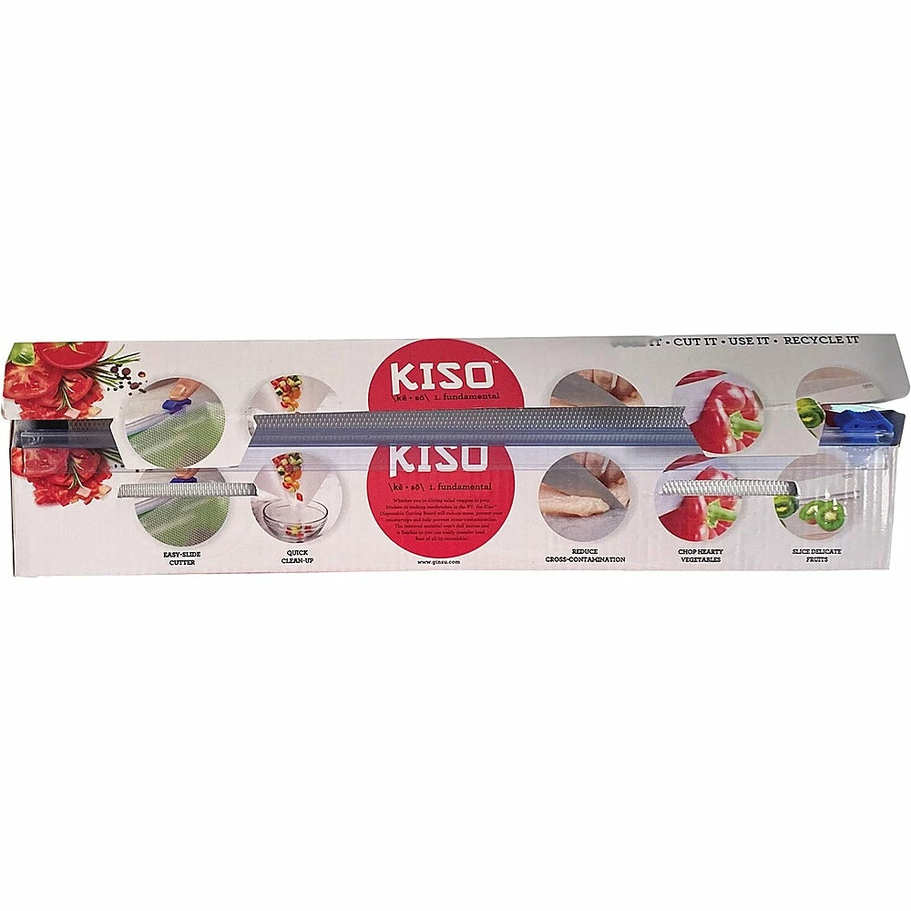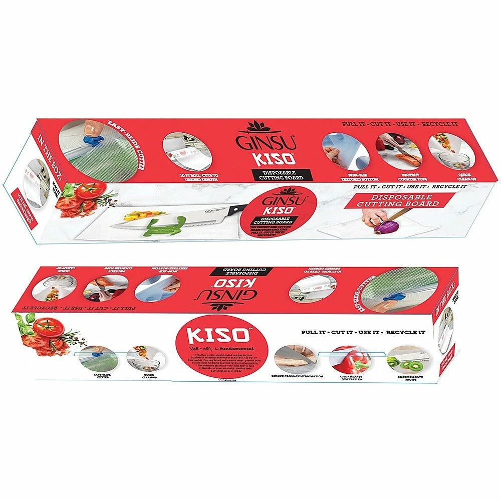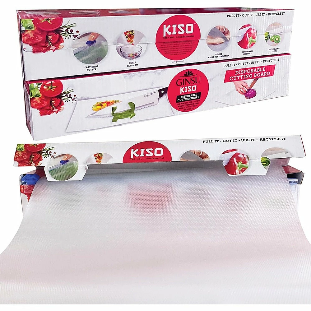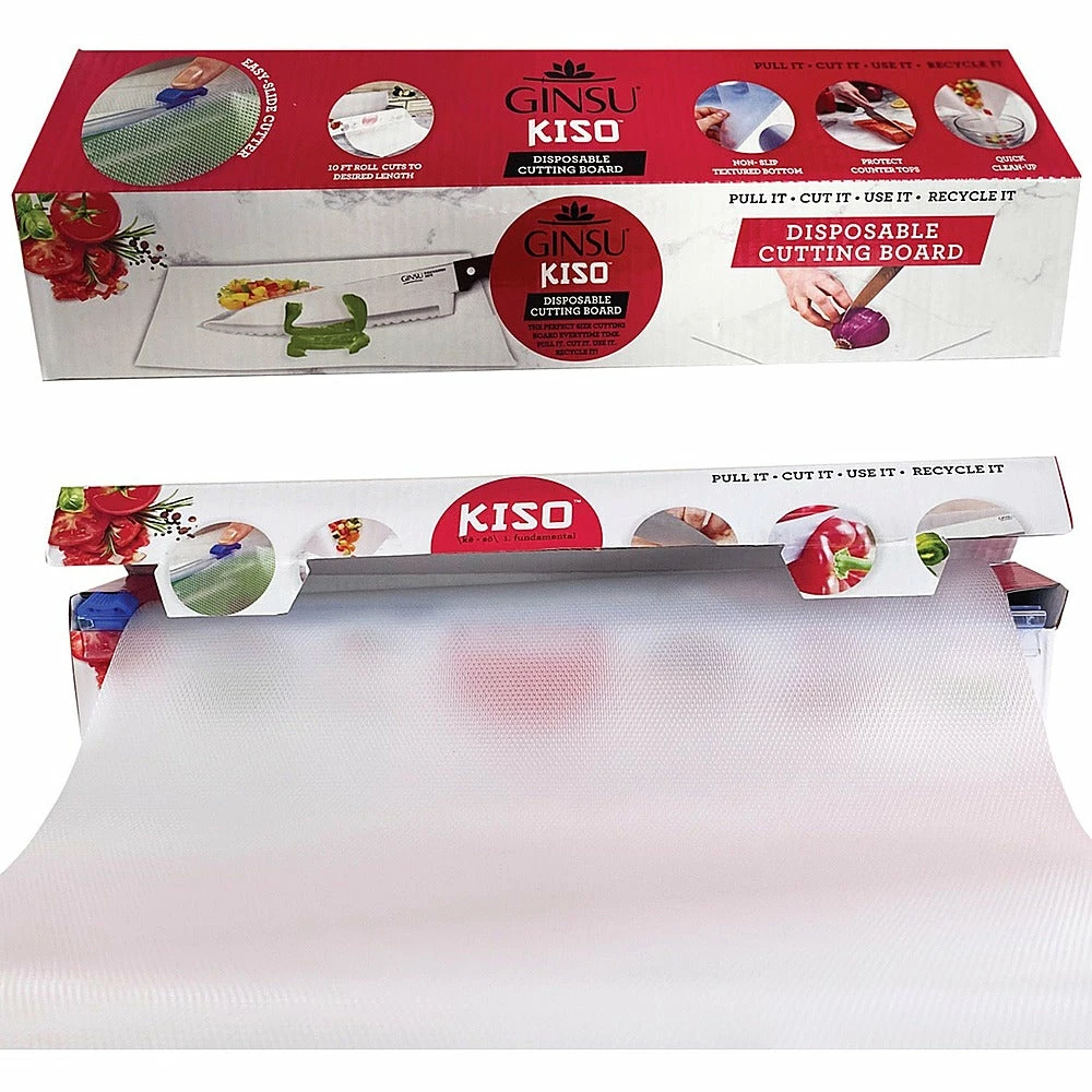 Designed to reduce messes and save time, the Ginsu Disposable Cutting Board GNZ-3005 is a convenient, compact companion. Whether you’re on the road, camping, or working with foods prone to cross-contamination, this roll of disposable cutting board is the perfect kitchen tool. The Ginsu cutting board comes in a convenient 10′ roll that can be quickly and easily trimmed to a custom size with the built-in slide cutter. It’s durable enough to use for chopping any food, even hearty vegetables and meats, and an anti-slip textured bottom helps to keep you and your countertops safe. The BPA-free textured material is designed to protect knives, and the pliable cutting board can be folded so you can easily transfer your food from the counter to the pan.