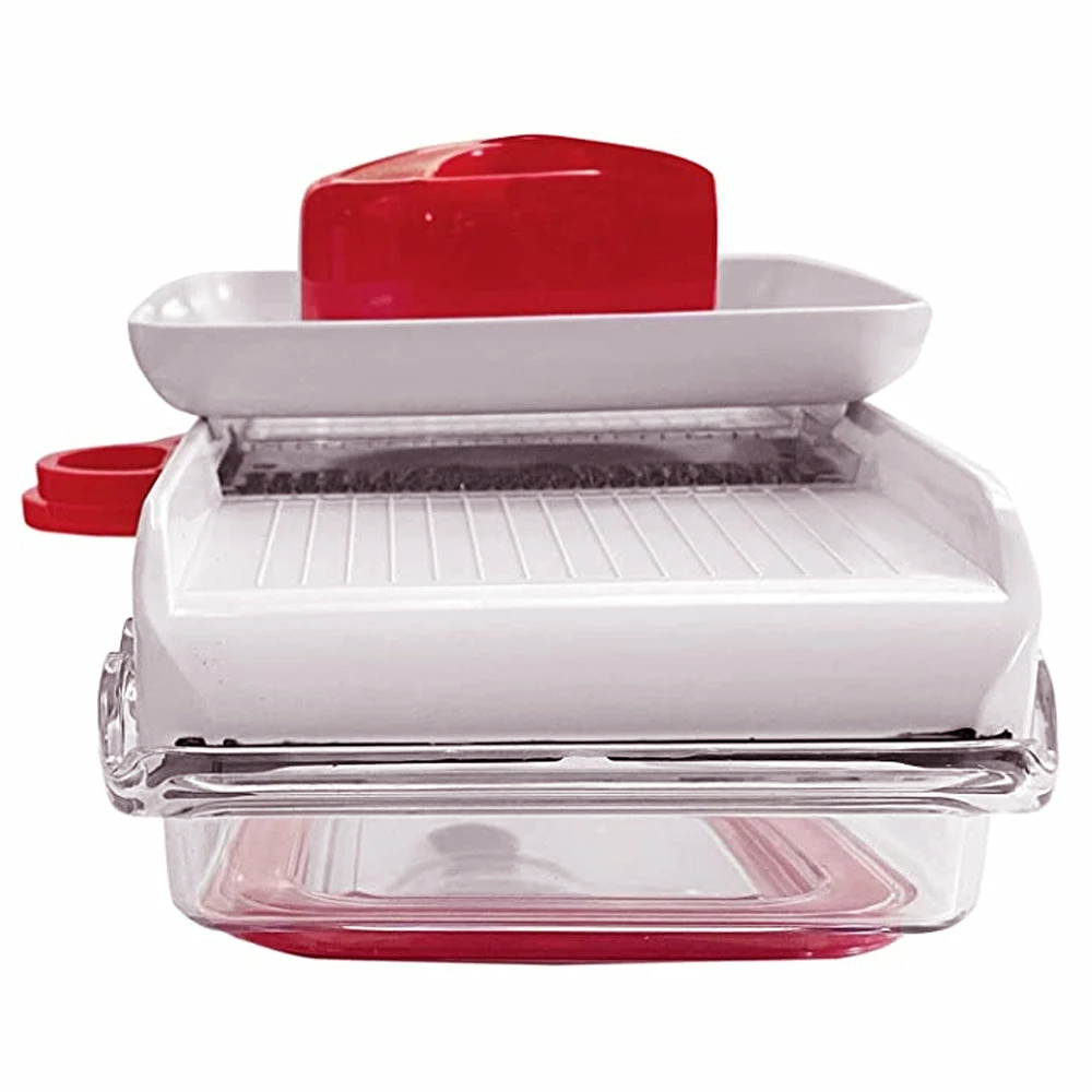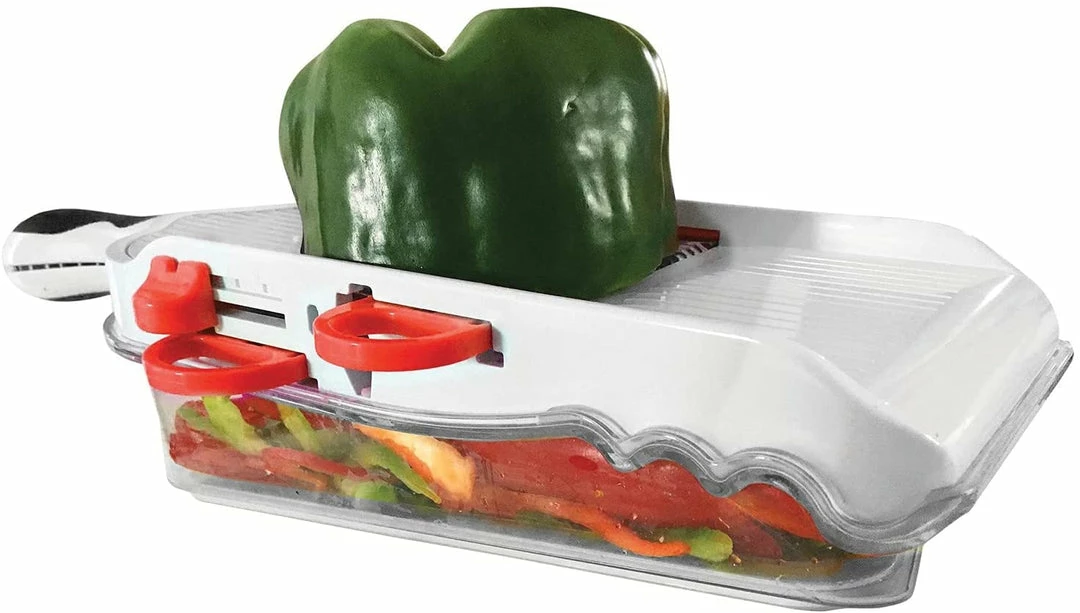 The Ginsu Kiso Multi-Purpose Chef Set is the perfect do-it-all vegetable, fruit, and cheese prep tool. It’s a mandolin, grater, and peeler all in one. With four (4) adjustable blades and three (3) thickness options, this space saving unit cuts effortlessly. Perfectly sliced food lands in the tray and not on your countertop. The included hand guard keeps your fingers safe. Since everything is dish washer safe cleanup is a breeze! Ergonomically designed, the soft grip handle detaches to become a built-in hand-held peeler. Anti-slip food tray base prevents slipping while in use, and the curved lip design is especially useful for draining.