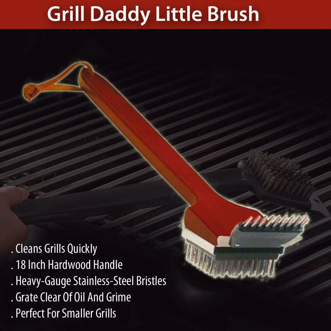The Grill Daddy Little Brush is specifically designed to protect your hand from the hot grill. Cleans grills quickly and easily. Bristles won’t fall out like ordinary wooden grill brushes. You don’t always need a huge grill brush to get results. Sometimes you just need a little spot cleaning, or if you have a smaller grill, you might need a smaller brush to accommodate the smaller area. Those who don’t grill often also won’t have as much debris on their grill. The Small Wooden Grill Daddy Brush may be the perfect solution for these situations. The brush features an 18 inch hardwood handle, which can stand up to vigorous scraping, as well as a steel brush. You can use the brush for cleaning your grill or even for household scraping jobs. With your grill, you’ll be able to keep the grate clear of oil and grime, helping to preserve your grill and make your food taste fresher. Just use the brush for a light cleaning after each use of your grill for a big impact on your grilling experience.