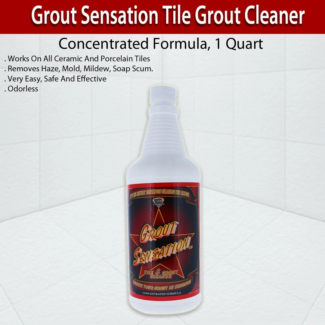 Its the newest sensation cleaning the nation. Renew your grout in seconds. Works on all ceramic and porcelain tiles. Removes haze, mold, mildew, soap scum, coffee, tea, koolaid plus so much more! Grout Sensation restores grout to its original color without heavy chemical odor. This product will not leave residue or sand particles. This product is very easy, safe and effective for use on all ceramic and porcelain tile. While mopping with floor cleaner only takes away the top surface dirt, Grout Sensation works deep into the grout lines to loosen and lift away dirt, mold, mildew and bacteria that deeply stain your grout over time. It will even remove stains as tough as permanent marker. The best way to apply Grout Sensation is either staight from the bottle or in a pump sprayer to the tiles grout line. You will begin to see the strong foaming action appear as the underlying particles are brought to the surface for easy wiping. For tough stains light agitation of the grout line with a deck brush will leave the grout looking new again. Follow up by mopping throughly with clean water and enjoy the look of your brand new floor. Includes: 1 x Grout Sensation Tile and Grout Concentrated Formula Cleaner- 1 Quart