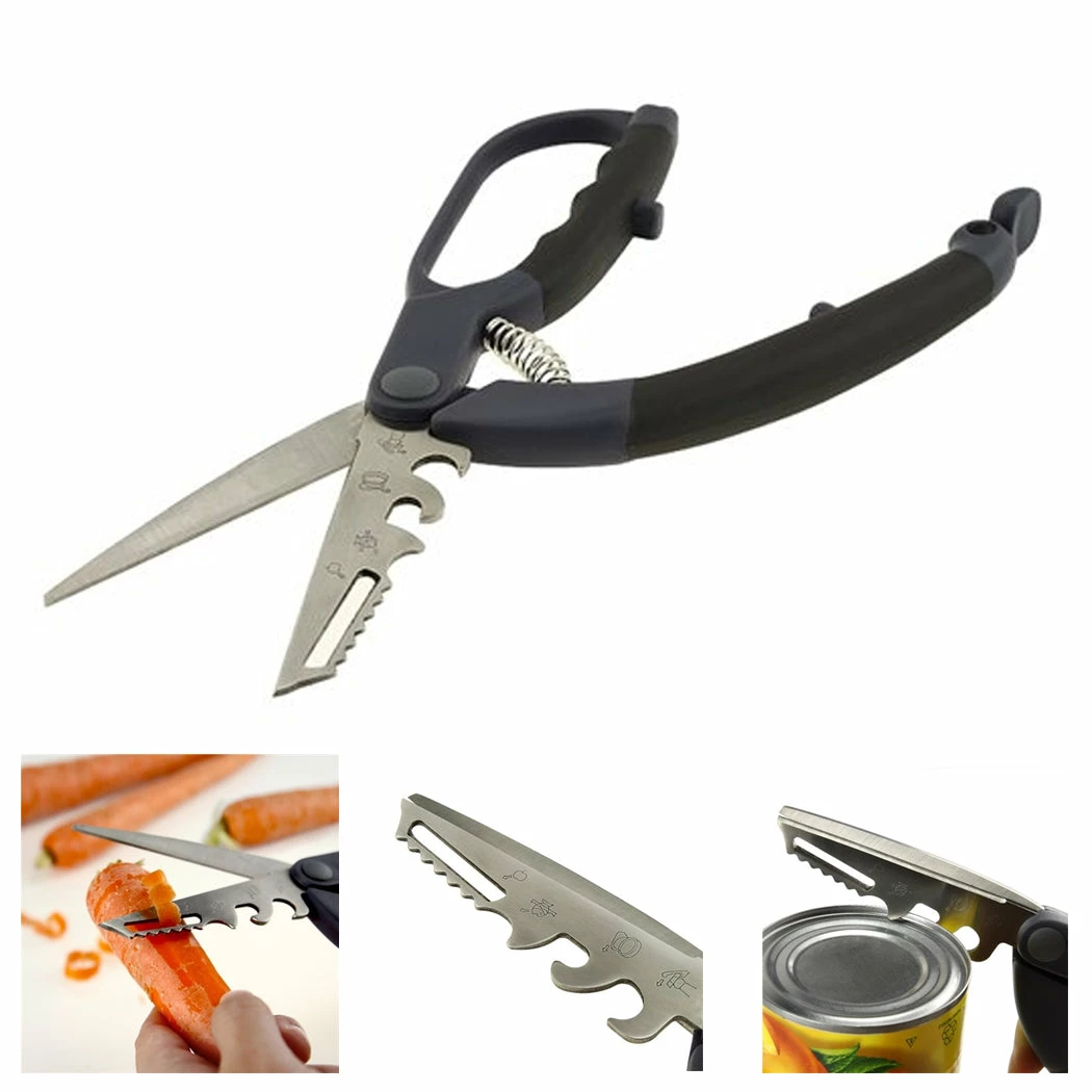 Handy Trends Multi Scissor 5 in 1 Function Tool Stainless steel 5 in 1 function Multi Scissors with ergonomic design, safety lock and protection arch. 5 in 1 includes: Peeler Scaler Corkscrew Can opener Bottle opener Safety lock ergonomic design Protection arch Stainless steel construction