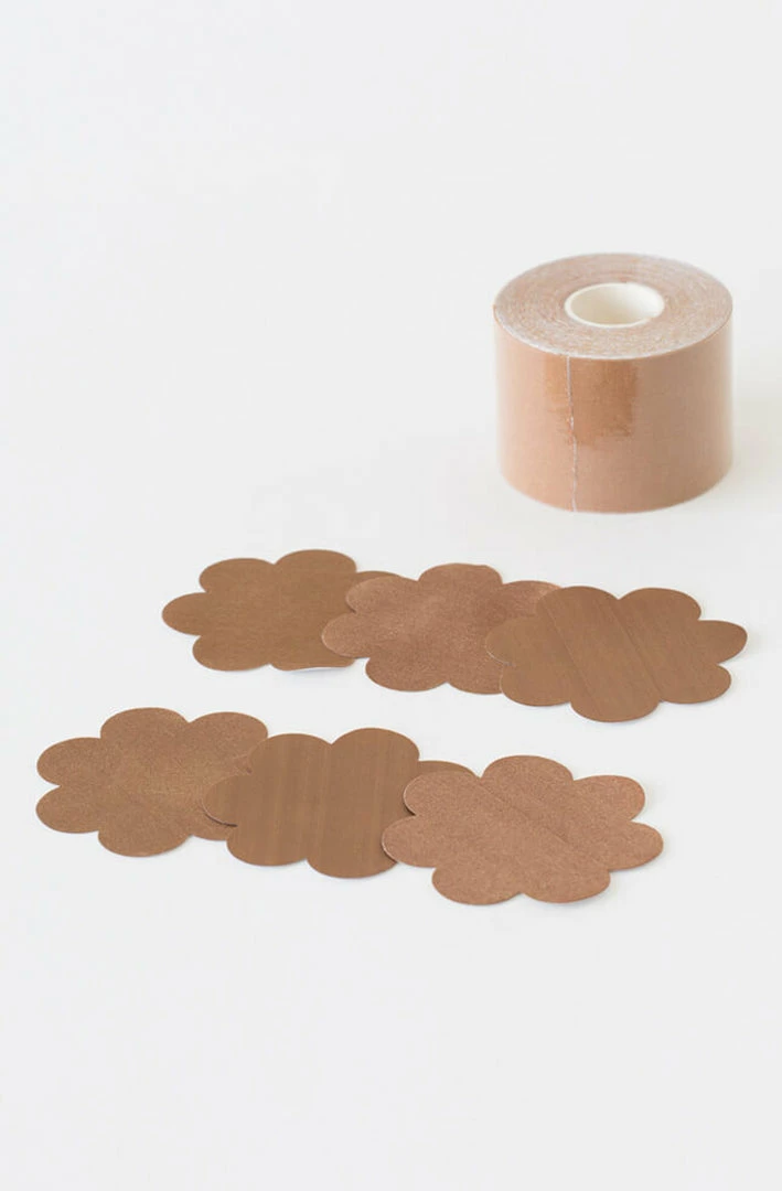 No one has to know. This will be our little secret… Breast-enhancing tape and pasties set is perfect for plunging and backless attire and includes a roll of sticky body tape, as well as three pairs of petal-shaped nipple covers with adhesive backing.