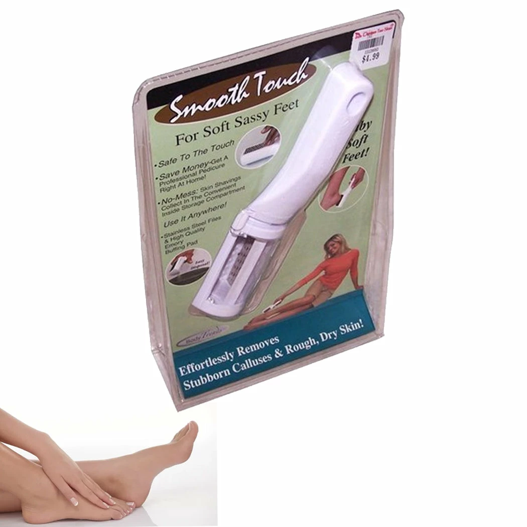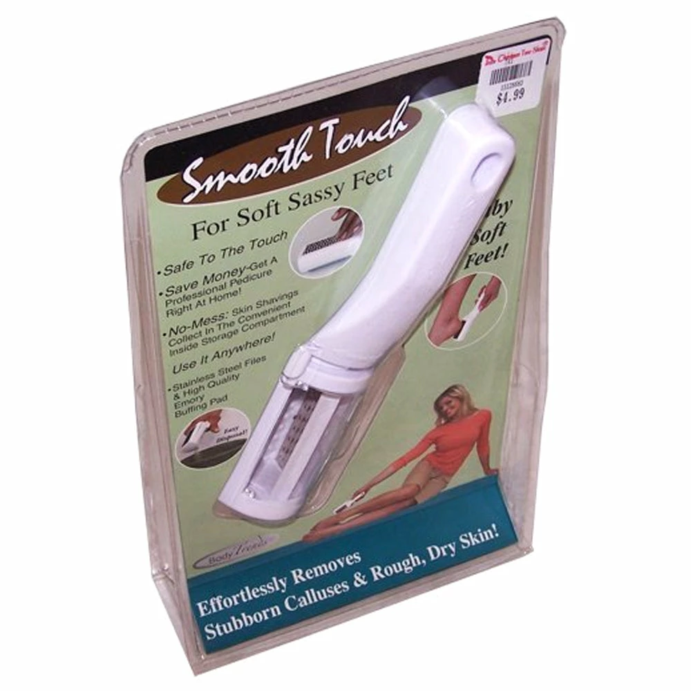Body Trends Smooth Touch Foot File & Buffing Pad. For soft sassy feet. Safe to the touch. Gentle & easy to use. Ergonomic design. Save Money – get a professional pedicure right at home! No-Mess: Skin shavings collect in the storage compartment. Use it anywhere! Baby soft feet! Precision stainless steel file on one side, high-quality emery buffing & polishing pad on the other side. Reveals smooth, healthy skin