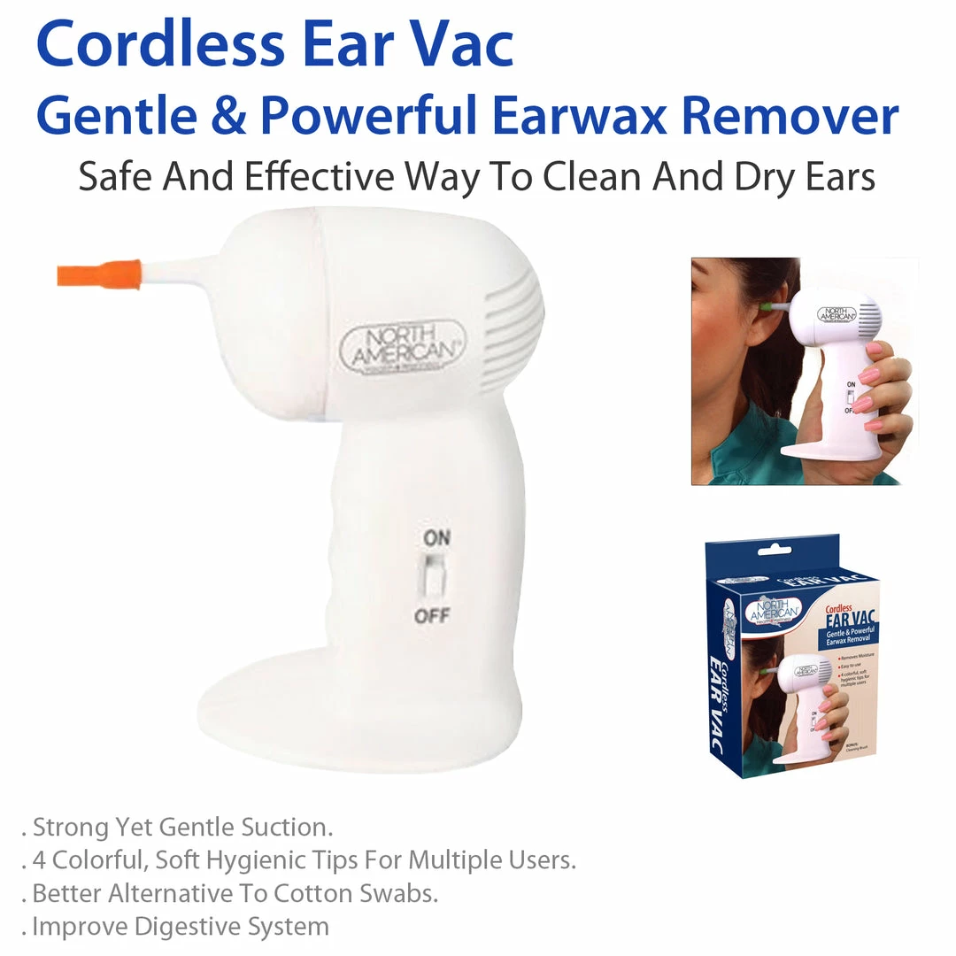 This gentle and effective ear wax removal system gives you a safe way to clean your ears. Convenient and cordless, the Ear Vac gently draws moisture and debris from the ears. Gentle suction draws dirt particles and moisture from the ear. With this ear cleaning system, you can say goodbye to cotton swabs and say hello to safe ear care treatments.