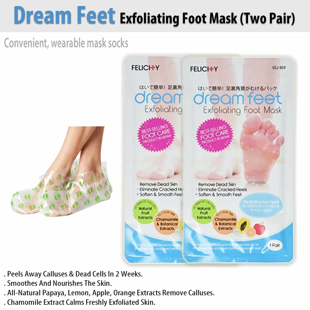 Dream Feet Exfoliating Foot Mask (Two Pair) A simple foot treatment that allows the skin to peel naturally and gives perfectly smooth feet. Treat your hard-working feet to a deep, all-natural conditioning! Dream Feet drenches your feet in all-natural fruit extracts to remove calluses, even as its chamomile extracts work to moisturize and nourish your skin. Calluses start peeling 4-7 days after use. Dream Feet has natural fruit extracts to remove calluses and natural chamomile and botanical extracts to calm skin. Dream feet removes dead skin, eliminates cracked heels and soften and smooth feet. Two Pack