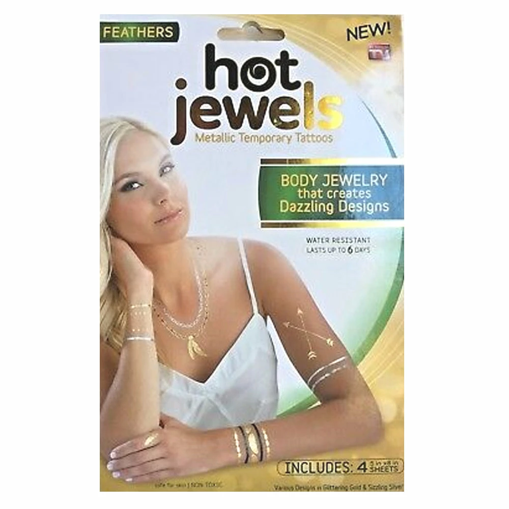 Add a touch of sparkle anywhere you need it. The metallic temporary tattoos of these Hot Jewels look like jewelry. Easy to apply, and easy to remove. They are water resistant and last up to 6 days.