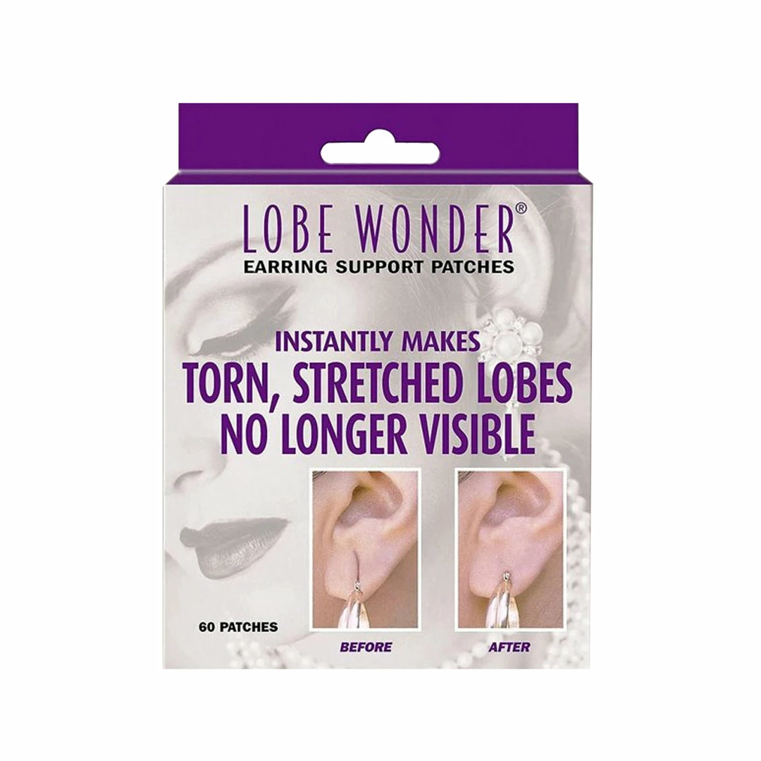 Lobe Wonder Ear Lobe Support Patches Lobe Wonder Support Patches work to repair the appearance of torn, damaged and stretched ear lobes instantly! Worn behind your ear lobe, these invisible patches are the perfect remedy to the problem of heavy pierced earrings tearing and s-t-r-e-t-c-hing your ear lobes. Each self adhesive oval patch is super-reinforced with a criss-cross network to strengthen and support ear lobes. Your ear lobes will look natural, not stretched and dragged down by the weight of heavy earrings. Lobe Wonder patches are “breathable” and the special medical adhesive doesn’t irritate the skin. With Lobe Wonder, you’ll be able to wear your chandelier earrings, hoops and favorite studs. And the best part? No more worry about tearing and stretching!