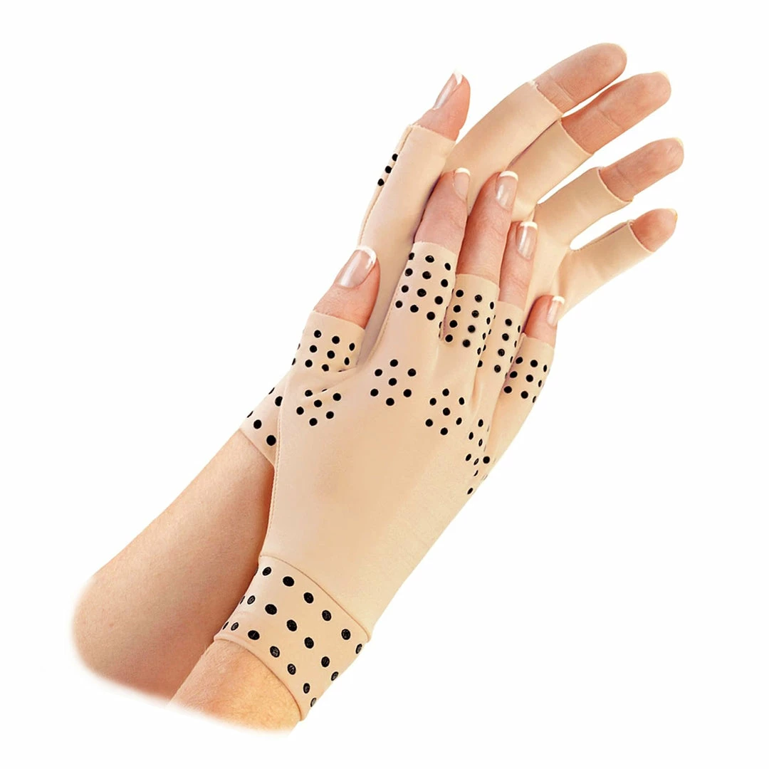 Ease the Pain of Sore, Arthritic Hands These lightweight, magnetic gloves provide gentle compression and soothing warmth to help ease the pain of sore or arthritic hands and fingers. Helps improve circulation and promote healing. Fingerless so you can go about your daily activities. Washable nylon/lycra. One pair. Specify size: Regular (fits most women) or Large (fits most men).