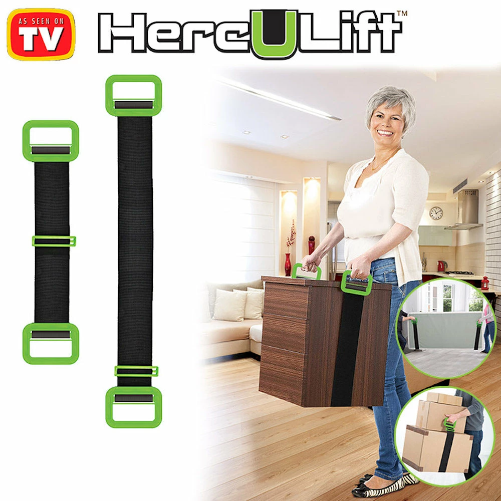 Easily lift, move or carry almost anything up to 300 lbs. with HercULift. Use it on furniture, mattresses, moving boxes or any heavy object. Super-strong, high-density nylon strap adjusts from 3′ to 6′ long. Adjustable strap from 2 1/2 feet to 5 feet allows for even weight distribution. Comfort grip handles keep hands from slipping and relieve pressure. Measurements: 4″W x 3′ to 6’L