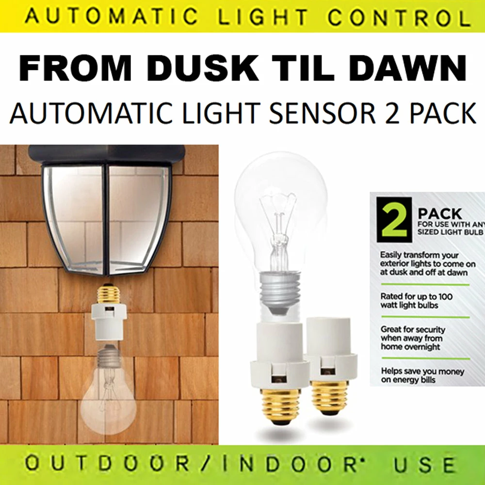 Lamp Holder Sockets with Photo Cell Sensors automatically turn ON Lamps at dusk or when it is dark and turn them OFF at dawn or exposed to light. This is a 2 pack set. These instantly turn any lamp into a home security system, protecting your home and family. Easy to use electric eye sensor simply screws into any light socket. Light bulbs then screw into the sensor. Bulbs to be used are standard size incandescent bulbs, 60 Watts to 150 Watts Maximum, suitable for a screw type socket. You may need to adjust the positioning of the sensor, to get the right position to avoid other sources of light from streetlamps or other ambient light to make the lamp work as desired. It is suggested to used duct tape or other opaque tape to cover as part of the sensor to tune the sensor to work as desired for various lighting conditions. This is not for use with flourescent bulbs, but only incandescent light bulbs. Also please note that this unit is designed to work with the U.S. Voltage 120V and Frequency 60 Hz of the U.S. and the socket is a screw type socket. So if you are in another country, please make sure that the voltage and current frequency match the U.S. Standards.