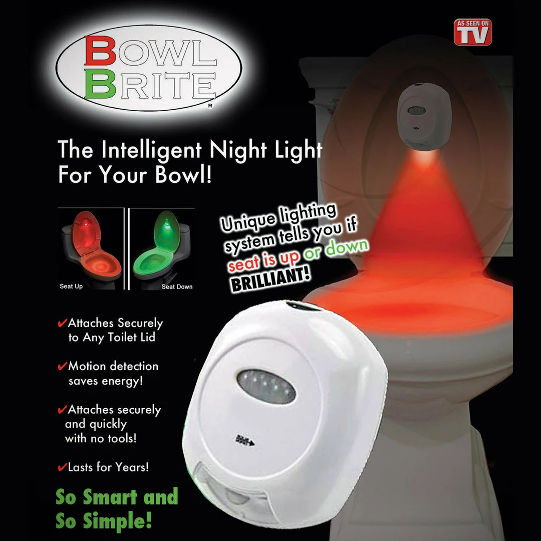 The intelligent night light for your bowl. Now you can have just the right amount of light where and when you need it. The soft glow in the middle of the night will put an end to having to deal with being woken up by harsh overhead lights. The unique and smart motion detection system senses your arrival from as far as 12 feet and turns itself on when you enter. It automatically turns off when you leave. Even more, the detection system will let you know if the seat is up or down by glowing red if the seat is up and green if the seat is down. Perfect for the elderly and children, as well as anyone who wakes up in the middle of the night to use the bathroom. Touted as a revolution in lighting technology and convenience.