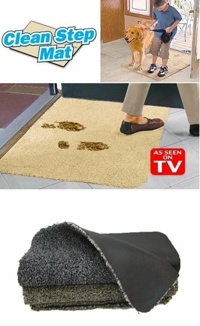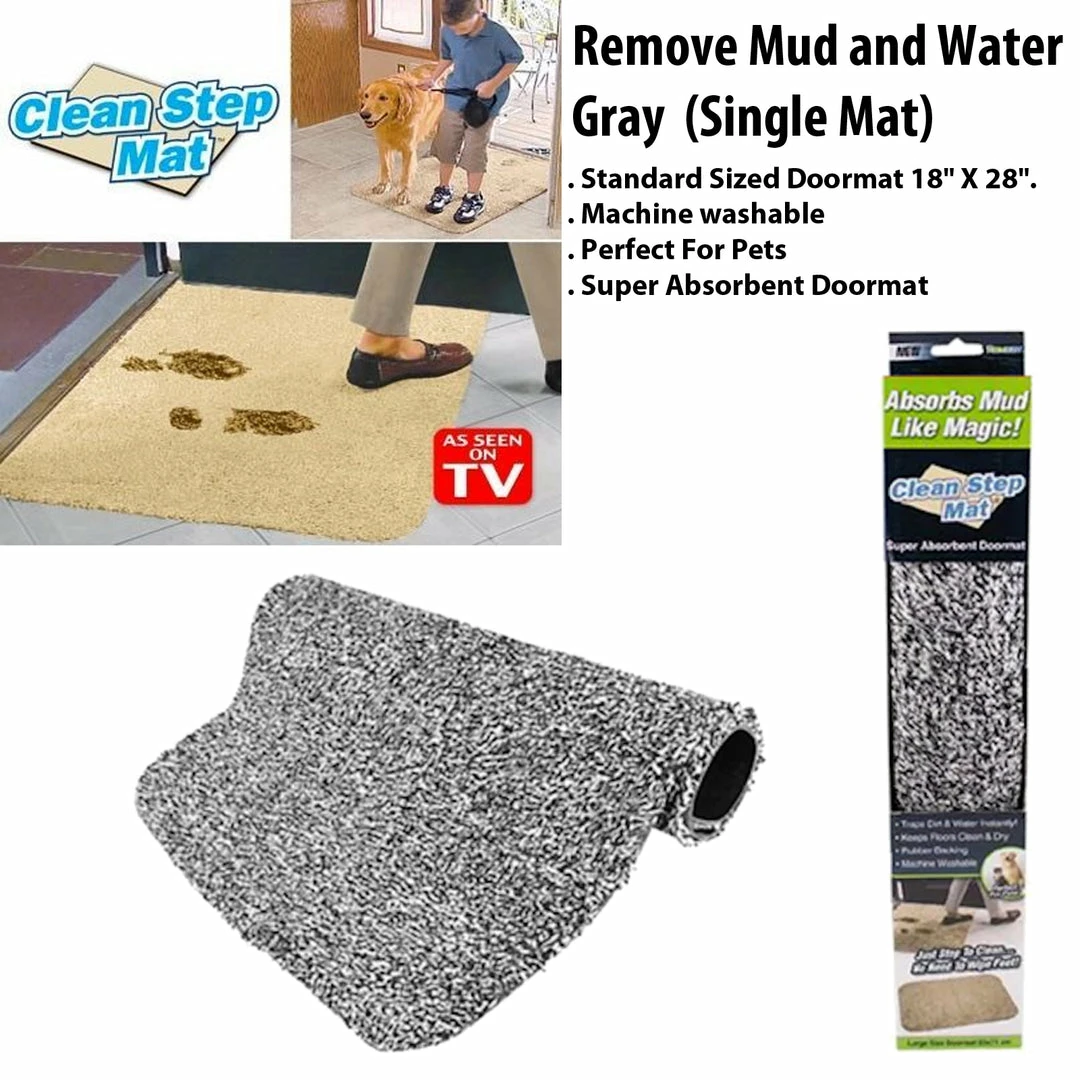 Clean Step Mat- Gray (SINGLE) Super absorbent doormat. Absorbs mud like magic! Now in new GRAY color! Just step to clean…no need to wipe your feet. Clean Step Mat absorbs mud like magic! Clean Step Mat, the super absorbent doormat traps dirt and water instantly, keeping floors clean and dry. Non-slip latex backing won’t slip or scuff floors. Low profile design so doors won’t get stuck. Machine washable. Clean Step Mat’s secret is millions of super absorbent fibers that absorb mud and water like magic. Just step to clean…No need to wipe your feet! Clean Step Mat, as seen on TV, soaks up mud, rain, snow, slush and sleet. No more messy floors. Great for the front door, back door, garage door or wherever there is a door! Perfect for kids and pets.The secret is the millions of super absorbent fibers that remove mud and water from shows instantly. Made of 55% cotton and 45% microfiber. Standard sized doormat 18″ x 28″. ****Mats are GRAY and ship in mail order (non retail) packaging Includes: 1 x Clean Step Mat (18″ x 28″) in GRAY