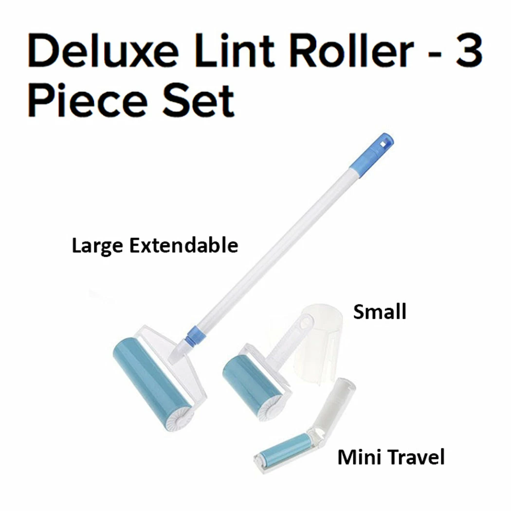 Deluxe Lint Roller 3 Piece Set Quickly cleans clothes, furniture, curtains, pillows, carpets, and floors. Removes lint, hair, dust, thread, pet hair and more easily and quickly. Reusablerollers wash clean with soap and water. Telescoping handle extends 4 feet for high and hard to reach spaces. Travel size unit fits easily into a purse or bag. The reusable, durable and washable design almost never needs replacement. (COLORS MAY VARY)