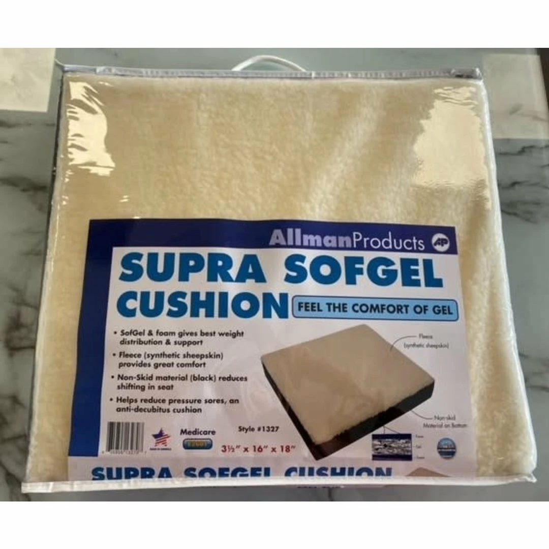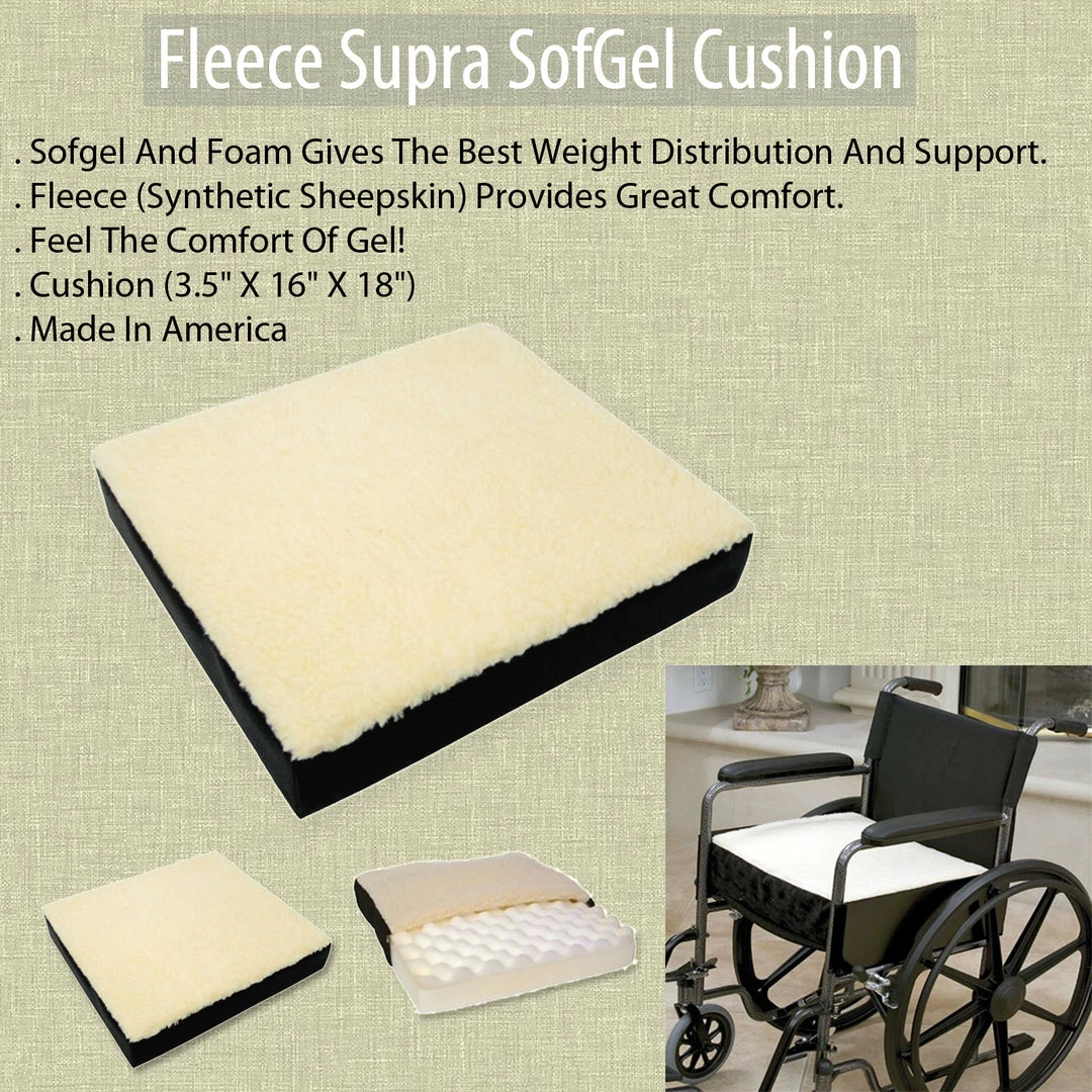 Fleece Supra SofGel Cushion (3.5″ x 16″ x 18″) Feel the comfort of Gel! SofGel and foam gives the best weight distribution and support. Fleece (synthetic sheepskin) provides great comfort. Non skid material (black) reduces shifting in your seat. Helps reduce pressure sores, an anti-decubitus cushion. Made in America Includes: 1 x Fleece Supra SofGel Cushion (3.5″ x 16″ x 18″)
