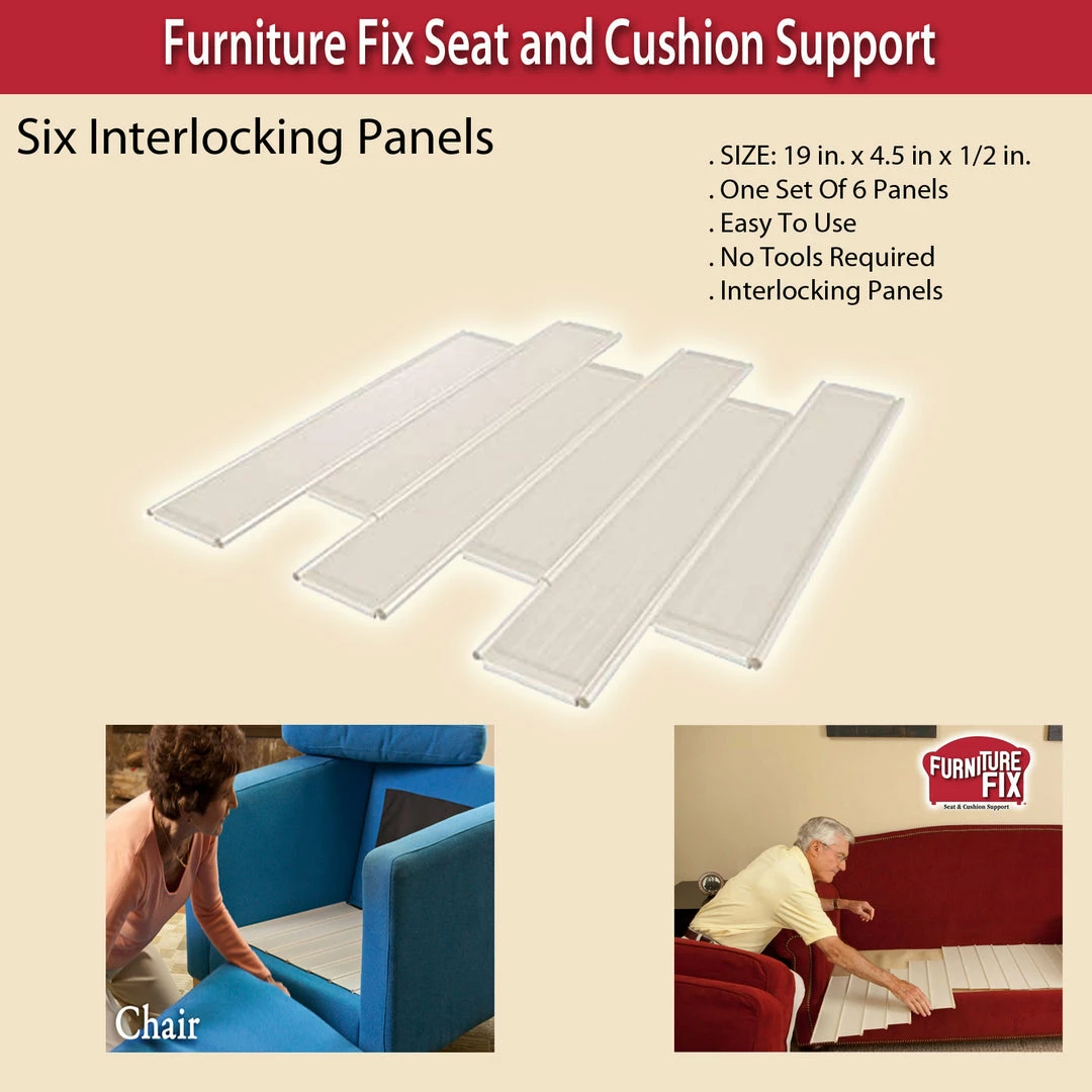 Furniture Fix Seat and Cushion Support lifts and fix your sagging upholstery. Experience renewed comfort. Just place Furniture Fix under the cushion for instant firmness. Furniture Fix the quick fix for old sagging furniture. Save money and your furniture. Weak sagging springs lead to uncomfortable sagging furniture, Furniture Fix as seen on TV provides instant support to sagging springs. So why throw out our favorite chair or sofa when you can renew it and experience great support with Furniture Fix. Easy to use, no tools required, just place Furniture Fix under sagging cushions for instant firmness. The six panels interlock instantly and are customizable to lift and fix sagging upholstery of any size. The especially designed to stand up to heavy use. Experience renewed comfort with Furniture Fix! Each panel measures approximately 19 in. x 4.5 in x 1/2 in. Recommended usage: One set of 6 panels- One upholstered chair Two sets – Love seat Three sets- Sofa. Includes: 6 x Furniture Fix Interlocking Panels (enough for one upholstered chair)