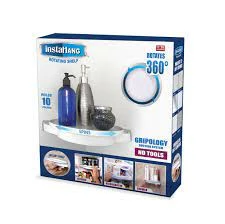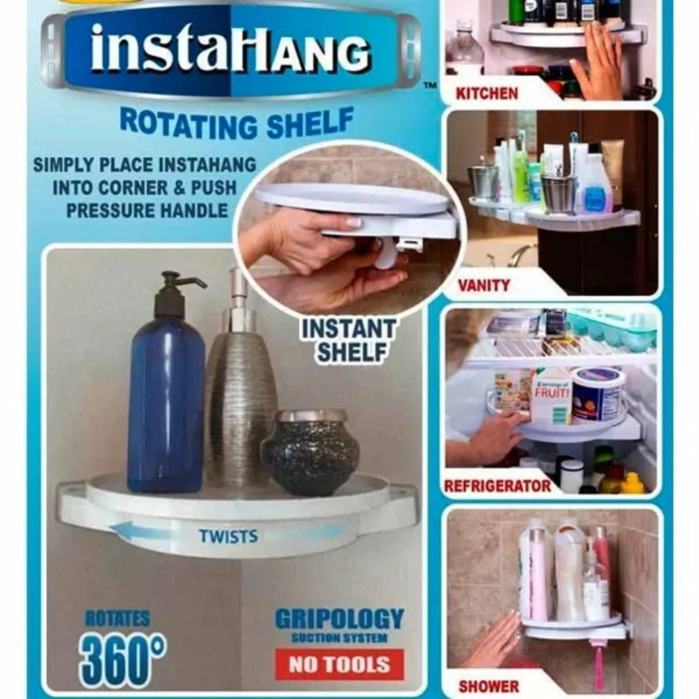 There’s never enough space! Cluttered counters, packed pantries, disorganized bathrooms. No tools or assembly required. It’s so strong, it can hold a 10 lb. iron! Reuse it anywhere.No tools, zero installation, will mount on any surface with the push of a handle. Works on any surface including tile, glass, marble and drywall.Polymer grip pads holds securely to your wall without damaging it. Cover for easy cleanup . Holds up to 10 lb. designed with Gripology polymer pressurized pads for maximum strength. Removes easily and patent pending. Rotates 360 deg. no more cluttered mess. Mounts to any corner, works on any surface; showers, kitchen, refrigerator, vanity. Organize it with Instahang, the rotating shelf. Just place Instahang in any corner. Push the pressure handles to lock into place, for double the space